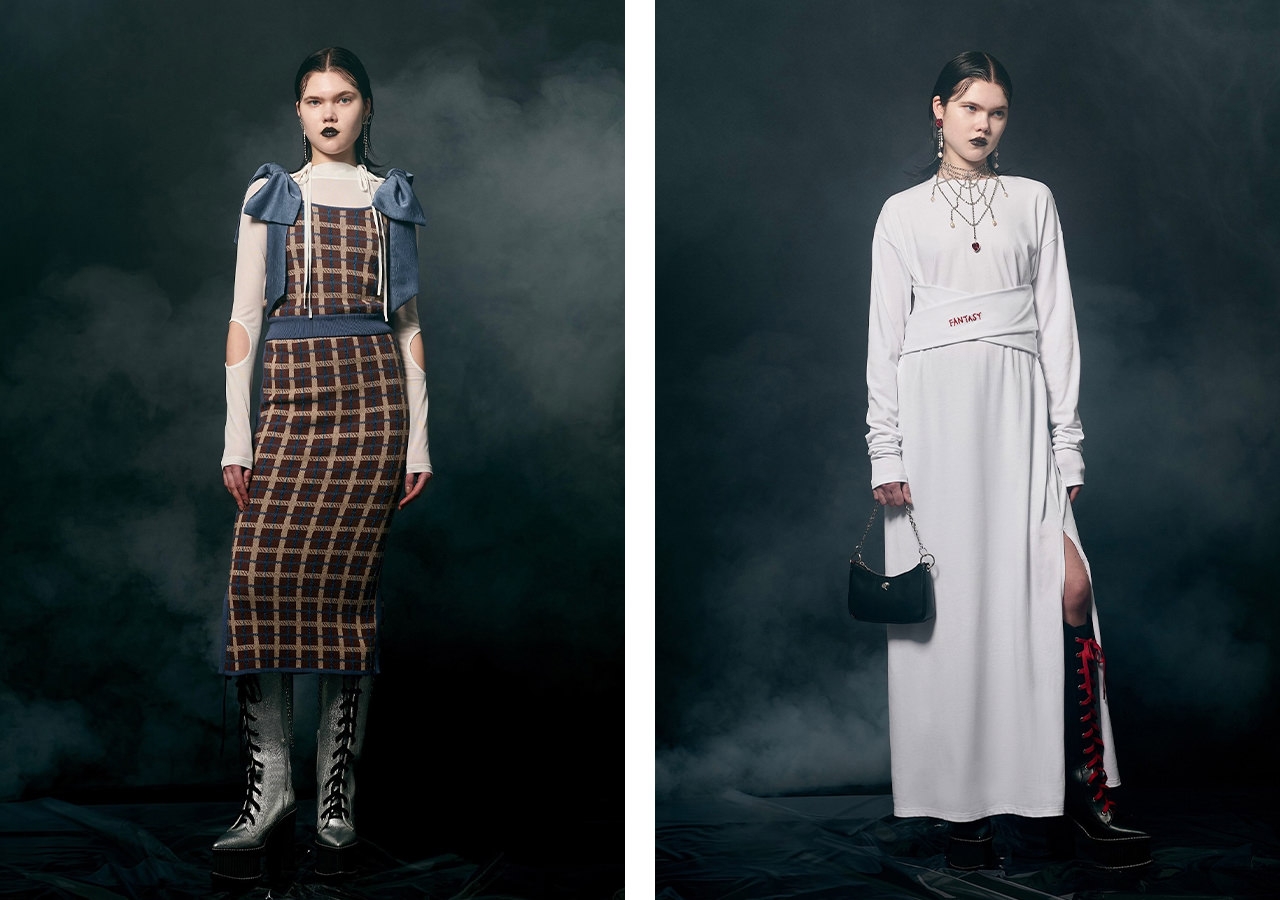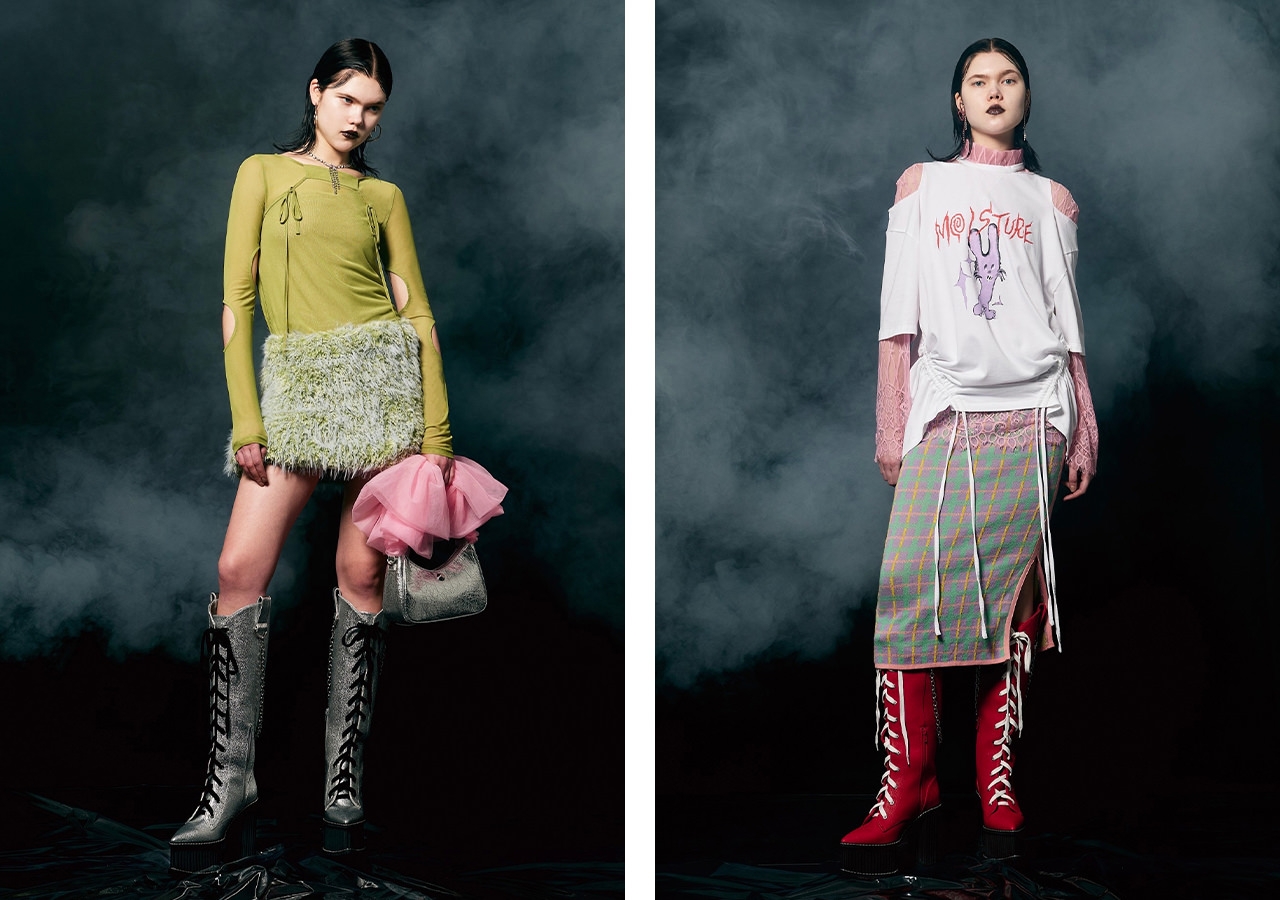 “MOIST PUNK”をテーマに、1970年代のU.K.パンクとロマンティックでしっとりとした世界観の二面性を表現。レッドやパープルなどの鮮やかな色とピンクやラベンダーのファンシーな対照的なカラーをミックスし、ペインター・MOMONSとコラボしたエッジの効いた「MOISTURE」のグラフィックも採用。繊細なコードレースのボンテージパンツやラップスカート、ミニとマキシをドッキングさせたチェックスカートなど、懐かしさを感じさせながら大胆で今のムードを纏ったルックに。ジュエリーは、クリスタルビジューで蜘蛛の巣を象ったネックレスやシルバーのキーホルダーパーツを使用したピアスが登場。