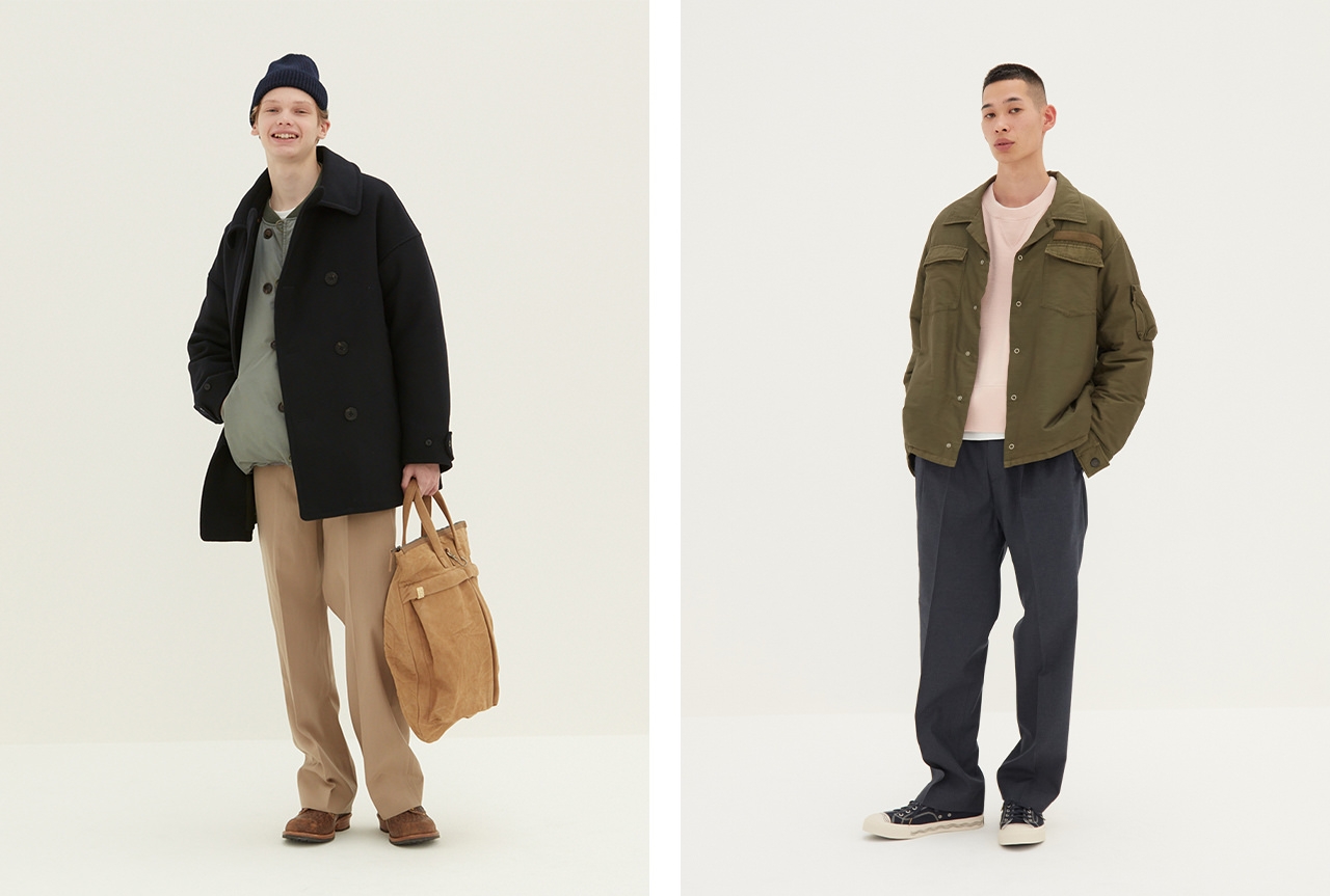 あらゆる製造工程を深く掘り下げ、オーセンティックなプロダクトを作り出す「visvim」。23AWコレクションでは、スリータックが入った太すぎないスラックスパンツを採用したルックに注目。ヴィンテージの風合いを出すためにリネン混率を増やした縮絨のピーコートは、経年変化で重厚感を増し、永く愛用できるのが嬉しい。またドロップショルダーのダウンジャケットは、柔らかくタフなナイロン生地に、ダメージ加工と奄美大島の伝統的な泥染め加工を施した手の込んだ一着だ。ピーコートの下にダウンジャケットを重ねた、新感覚のスタイリングをお手本にして。8月5日(土)より販売予定。