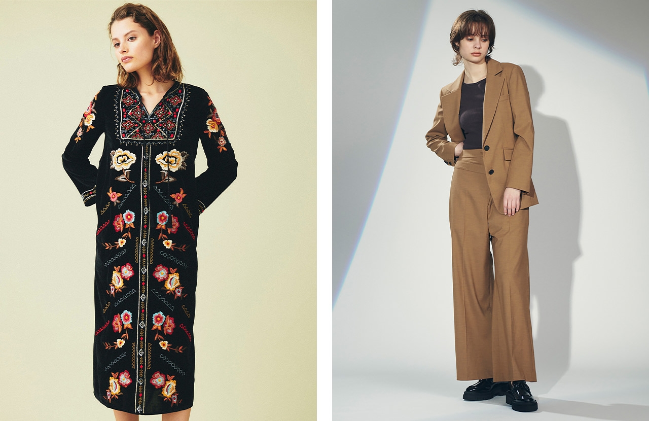 “graceful days”をテーマに、ペイズリーやビーズの刺繍、クラシカルな大きな花柄を取り入れた華やかなデザインを展開。なかでも注目したいのは、ベルベッド素材にビーズと糸刺繍をあしらったブラックワンピース。世界中を駆け巡ったデザイナーがその土地から得たインスピレーションとこだわりの素材で丁寧に作り上げる、ブランドならではの美学が詰まった一着となっている。纏うだけで優雅な気分にさせてくれるエレガントなワードローブが、日常を輝かせてくれるはず。