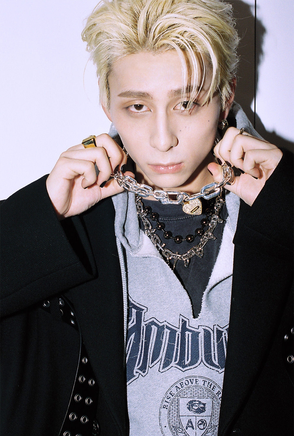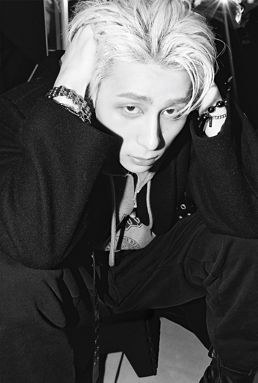 “AMBUSH ACADEMY”と謳ったスクール風のノースリーブパーカーにハーネスを取り付けたようなオーバーサイズのコートを羽織り、ブランドの象徴とも言える重厚感漂うレイヴブーツをまとった西洸人さん。それは一見するとスクールユニフォームのように見えるけれども、制服を脱ぎ捨てて、純粋な自分らしさを自由に追求した自己表現でもある。