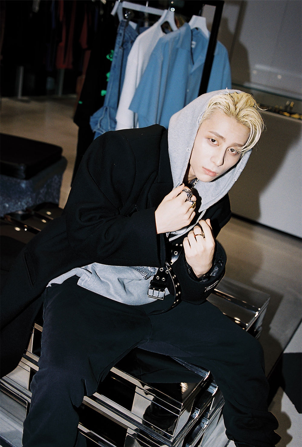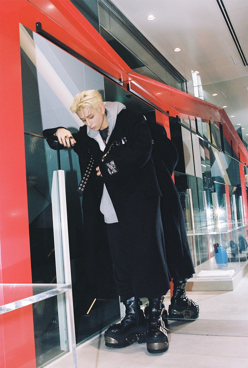 BELTED LONG COAT ¥340,450、AMBUSH ACADEMY VEST HOODIE ¥45,100、GRAPHIC T-SHIRT ¥41,800、REGULAR SWEAT PANTS ¥52,250、RAVE BOOT ¥169,400