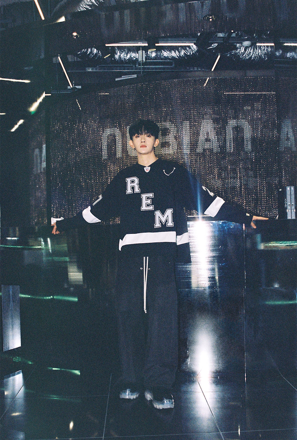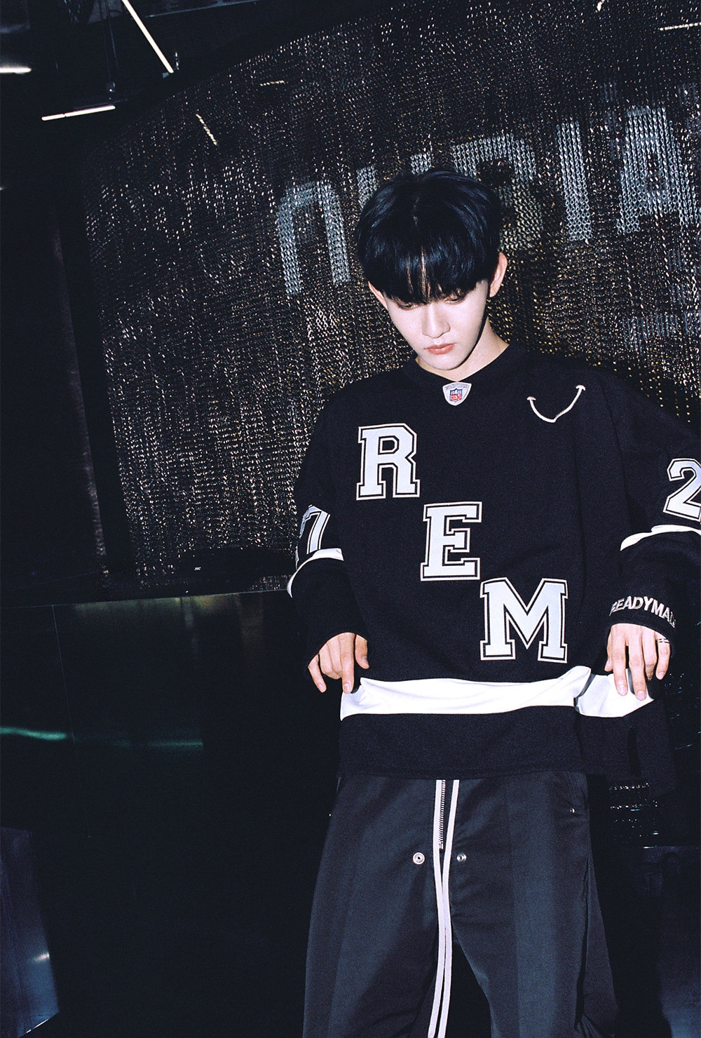 この秋冬にNUBIANが注目しているのは、「Rick Owens」「entire studios」「READYMADE」の3ブランド。この日、田島将吾さんが着用したのは、2013年に日本人デザイナーの細川雄太がスタートさせた「READYMADE」。デッドストックのミリタリーアイテムを再構築し、新たなアイテムとして昇華させ作り出す唯一無二な世界観に熱狂的なファンも多いアップサイクリングブランドだ。ホッケージャージをモチーフにデザインされた「GAME SHIRT SMILE」は、スマイルマークやブランドロゴが散りばめられ、スポーティーながらもモードなアイテムとも相性がよくコーディネートの幅も広い一着。