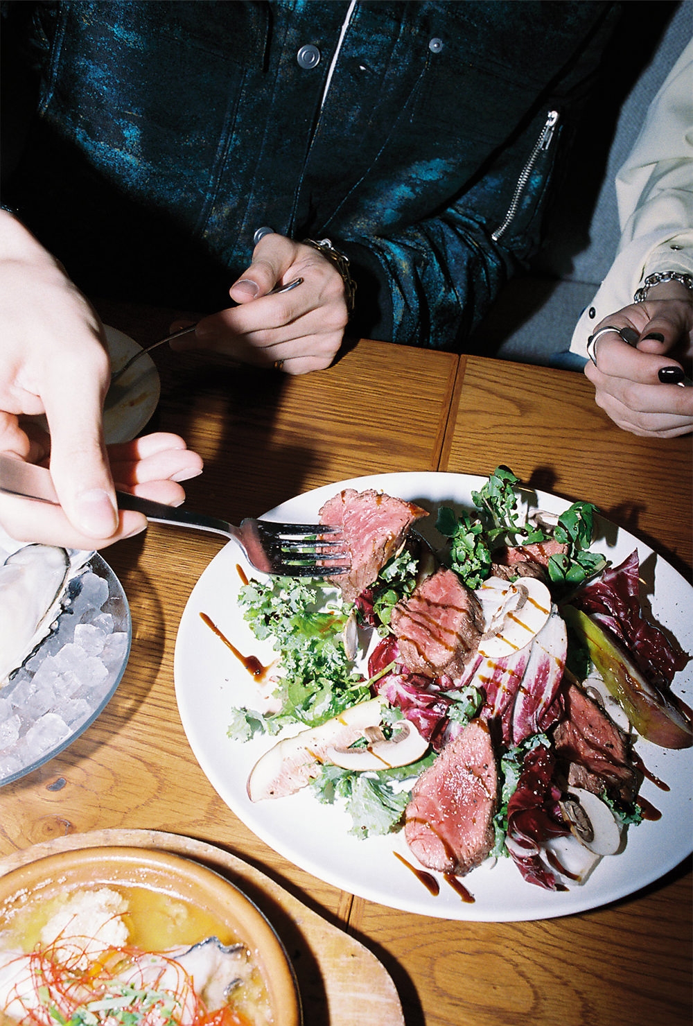 続いてオーダーしたのは、グリルしたジューシーな赤身肉・アメリカ産アンガス牛サガリの薄切りをバルサミコソースでさっぱりとした味付けでサラダ仕立てにした「US産 牛サガリのタリアータ」と、大ぶりの牡蠣と濃厚な旨味の詰まった塩たらこを自家製ガーリックオイルで加熱した「広島県産 牡蠣と北海道産 塩たらこのアヒージョ」。そして最後に、新鮮なオイスターの魅力を存分に味わえるSpiralの自慢のメニュー「国産 生牡蠣の食べ比べ」を。期待に胸を膨らませて大きな生牡蠣を口の中に入れた瞬間、ふたりは目を合わせて「うまっ!」と叫ぶ。「この牡蠣を食べた瞬間、『うわ〜、これが欲しかった!』ってなんか胸にストンと落ちたような感動がありました」と田島さん。