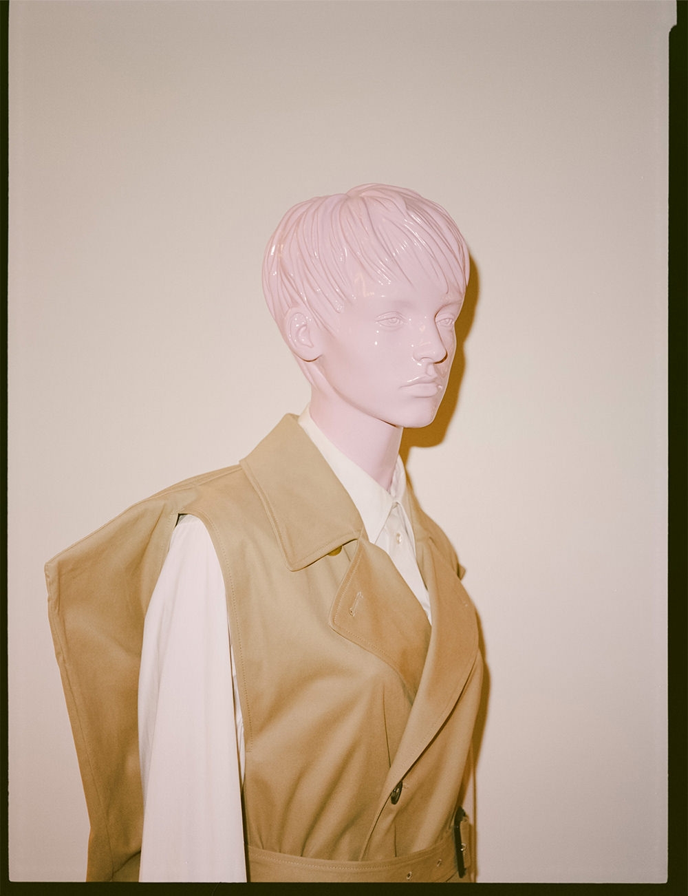 DISTRESSED COAT ¥312,400、LASER CUT LONG SLEEVE TOP ¥108,900、LASERCUT BOOTCUT TROUSERS ¥101,200、PAW LEATHER MULE ¥134,200