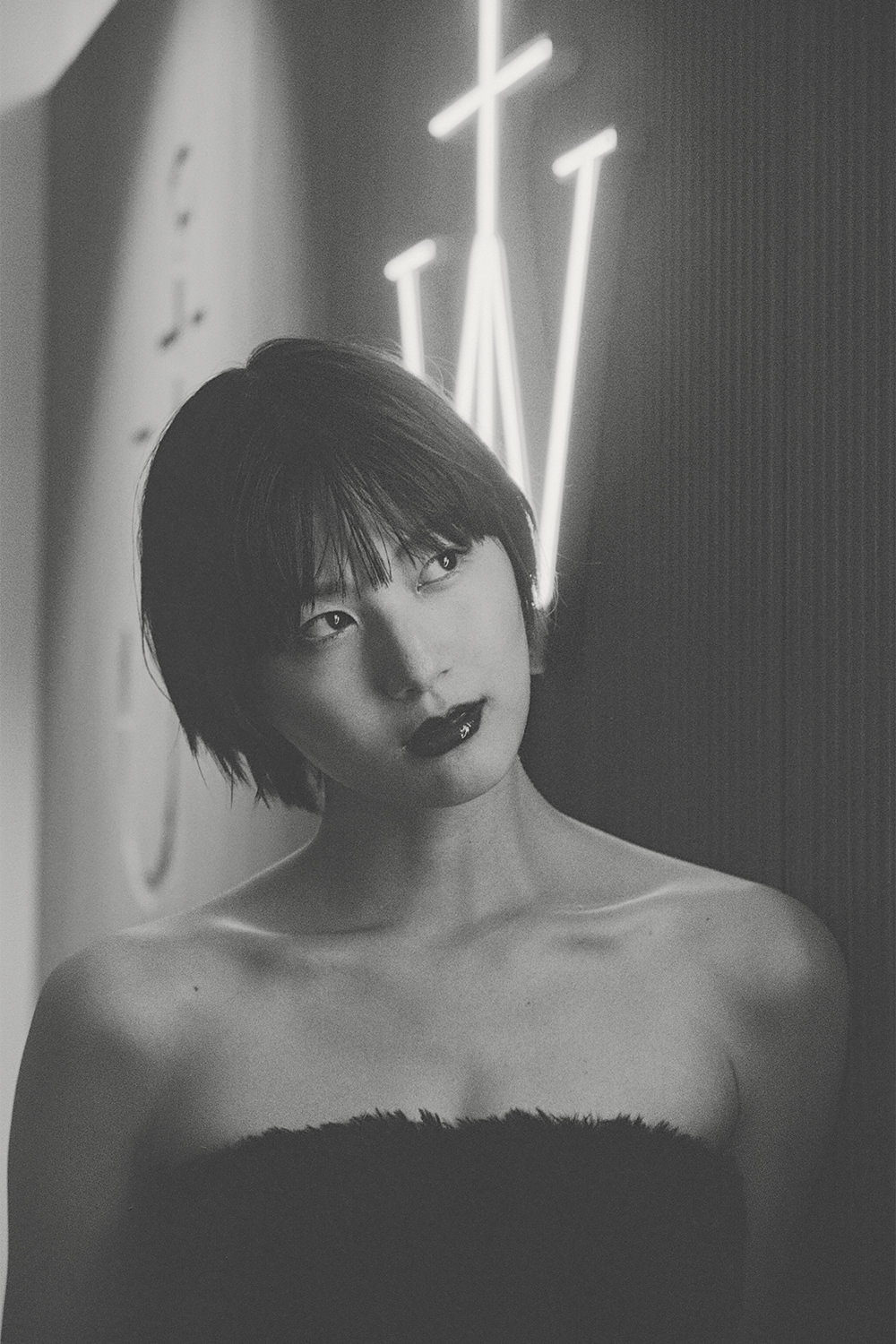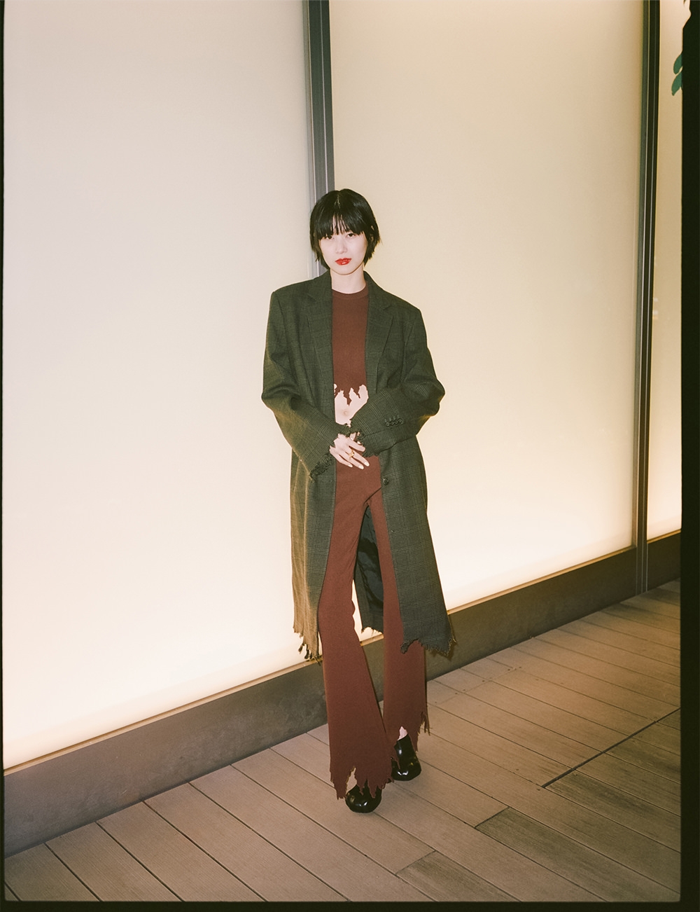 稲垣さんが着用するクロップド丈のニットは、裾にレーザーカットのダメージ加工が施され、背中にはJW ANDERSONのロゴであるアンカーが刺繍されている。控えめなフレアシルエットのパンツにはスリットが入り、脚をとてもエレガントに美しく見せてくれる。