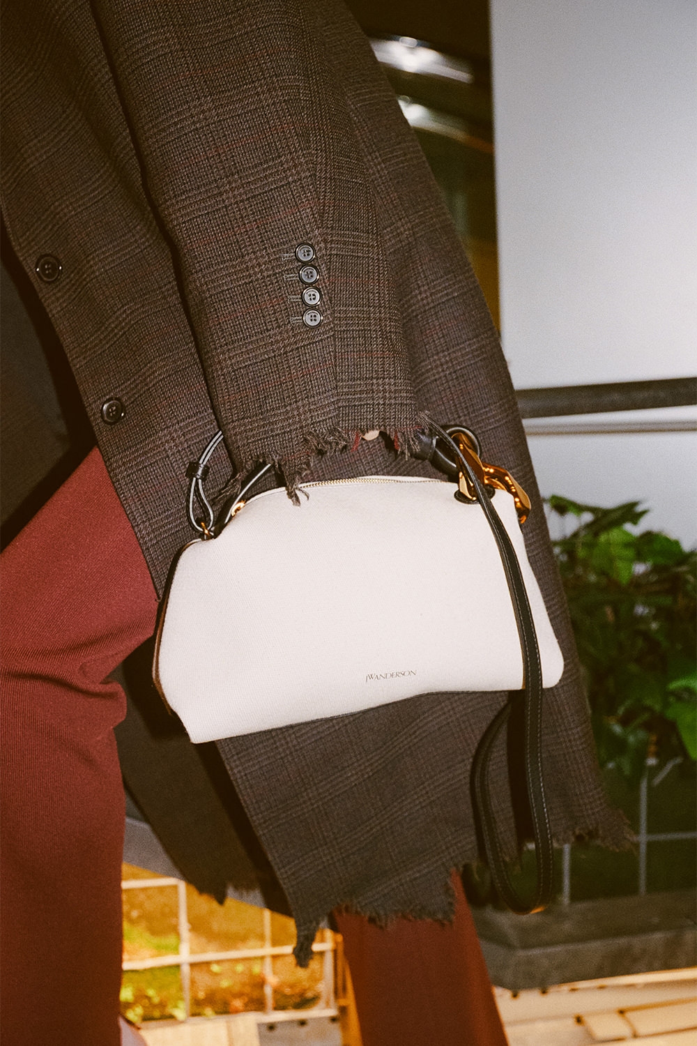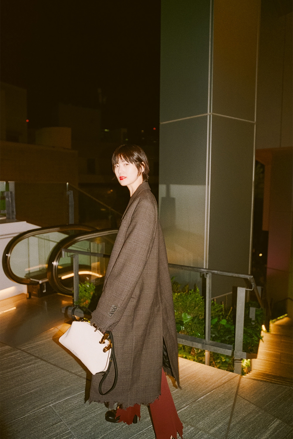 稲垣さんが手にするバッグは、ブランドを代表するチェーン・リンクをバッグの角にあしらった新作“コーナーシリーズ”のJWA CORNER BAG。丸みを帯びた台形シルエットにゴールドトーンの金具がステートメントなアクセントになっている。