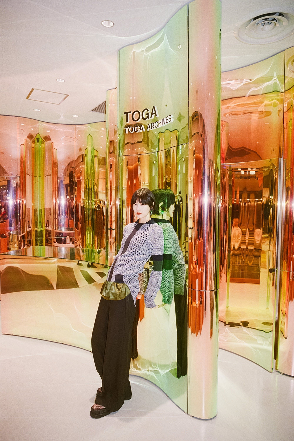 TOGA渋谷PARCO店では、ランウェイラインの「TOGA」をはじめ、コレクションラインのデザインで反映される造形やムードをデイリーに落とし込んだ「TOGA PULLA」、メンズライン「TOGA VIRILIS」やシューズコレクションなどをフルラインで展開。小物やアクセサリーの品揃えも豊富で、ここでしか手に入らない渋谷PARCO店限定アイテムも取り扱う。2024年春夏TOGA PULLAプレコレクションは、レイヤードの概念をより自由なスピリットで表現。トラディショナルな柄のメッシュプリントや、肌が透けたクロシェットニットなど、TOGAらしいエッジの効いたスタイルへと見事に昇華されている。