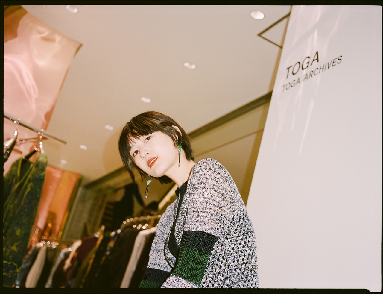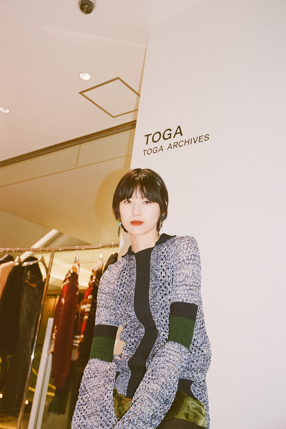 「TOGAはブランドロゴが服になくても、『これはTOGAだ』ってわかる。それは、オリジナリティあふれるエッジの効いた感じとか、強さとか。TOGAが放つモード感がすごく好き。今日着たかぎ編みのニットも、可愛さがありながら配色や肌が透けて見える素材感、袖のボリュームがとてもおしゃれで。プライベートで着たいなと思うスタイルでした。ファッションは、自分自身を表すもの。最近、私が始めたことは……服を選ぶ前に、その服を着て道を歩いている自分自身を客観視しながら想像すること。これをやり始めたら、服選びがすごく楽しくなって、ちょっとウキウキしてくるんです」と稲垣貴子さん。