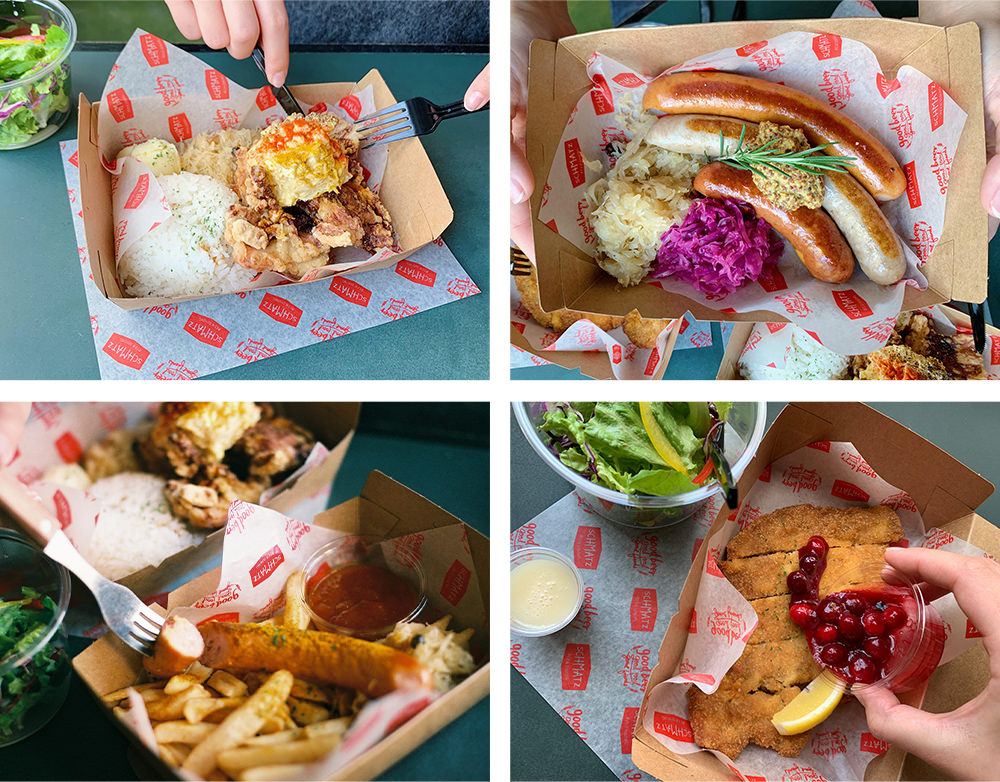 ドイツ料理をカジュアルに楽しめるビアダイニング「SCHMATZ Beer Dining」では、テイクアウト用に数種類の弁当を販売。イチ押しは、ザワークラウトのタルタルソースでドイツ風にアレンジした「ビアチキンからあげ弁当」(左上)。ディナータイムには、肉厚ジューシーなソーセージをはじめ、「シュニッツェル」(右下)というポークカツレツや、ソーセージにカレー味のソースを合わせた「カリーヴルスト」(左下)など、ビールが飲みたくなるドイツのソウルフードがそろう。