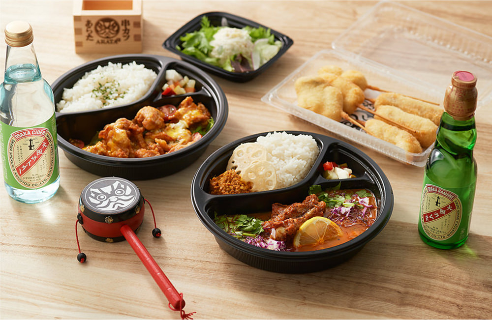 自家製の衣とソース、新鮮食材の手仕込みが自慢の「串カツあらた」は、テイクアウト用に4メニューを用意する。ランチで人気の「大阪!スパイスカレー」は、10種類以上のスパイスをブレンドしたスパイスカレーとキーマカレーが両方味わえるほか、さまざまな具材も入った欲張りなひと皿。家飲みのお供には、人気串6本が入った「あらたセット」や、家族や友人とシェアするのにちょうどいい牛カツ30本の「串カツセット(横綱)」も。