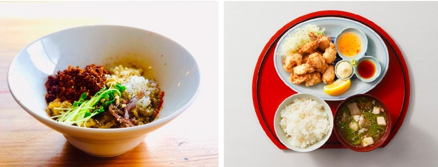 (左)エゾ鹿坦々麺(汁なし)¥1,000、(右)<ランチ限定>うさぎワニW唐揚げ定食(税込)¥1,620