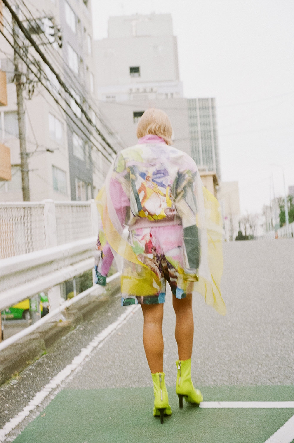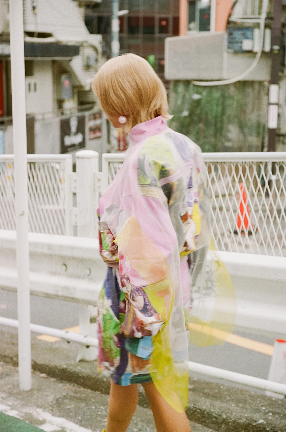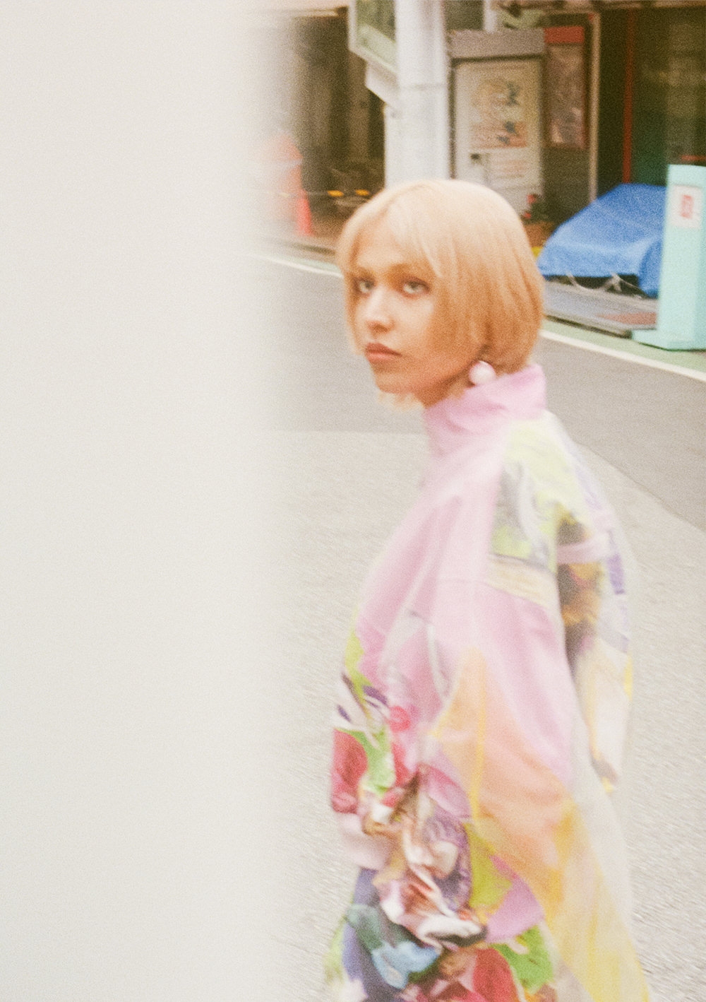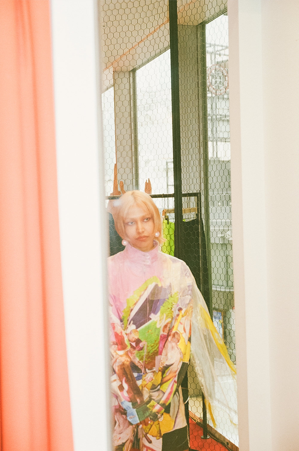 シャラさんが着用するルックは、デザイナー 高橋盾氏がかねてから尊敬していたドイツの現代アーティスト Neo Rauchの絵画を起用した春夏の新作。“Deep Mist”というコレクションのテーマが彼の世界観と共鳴し、初めてのコラボレーションが実現した。