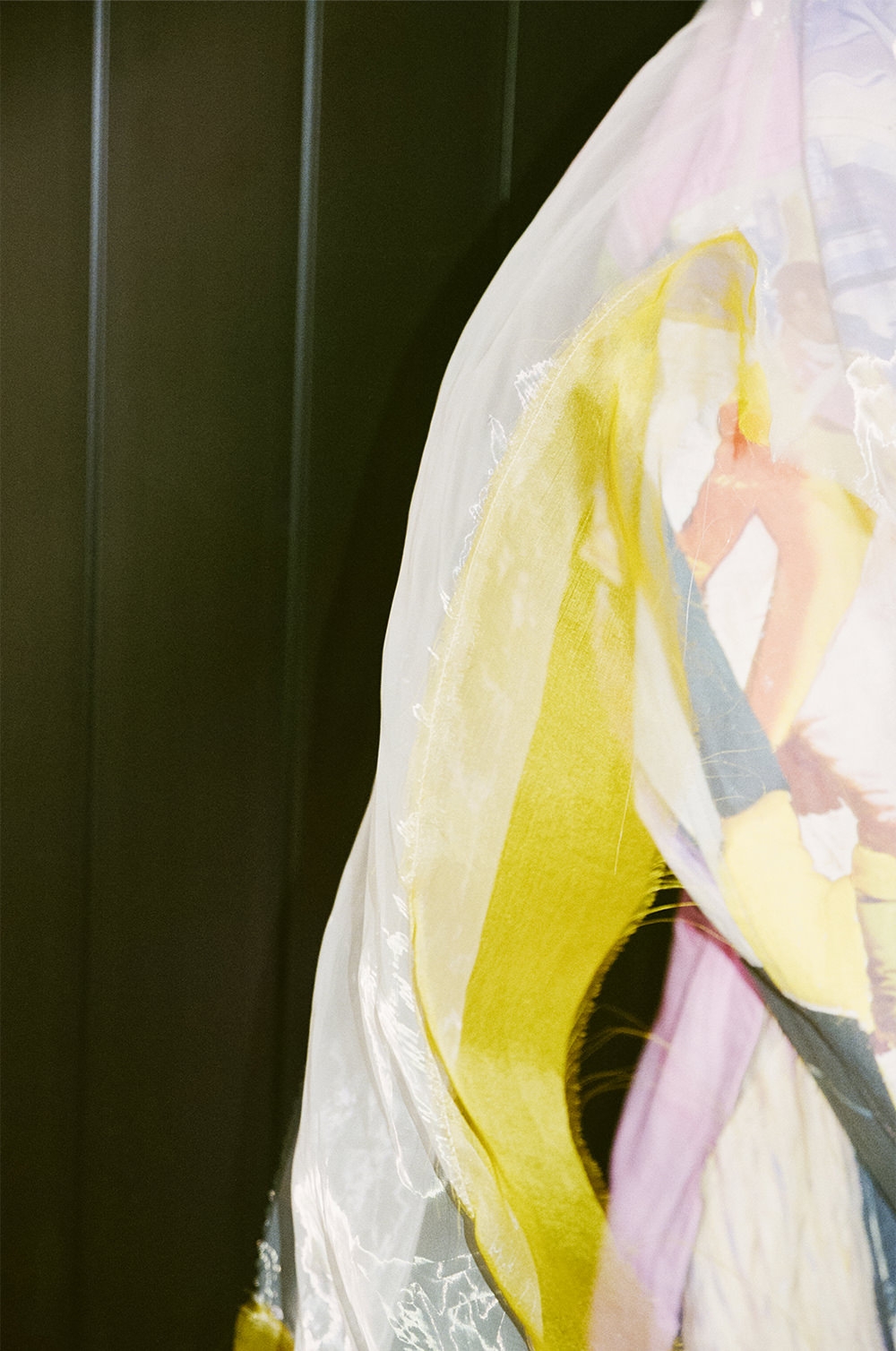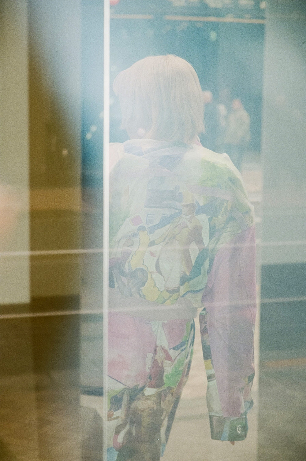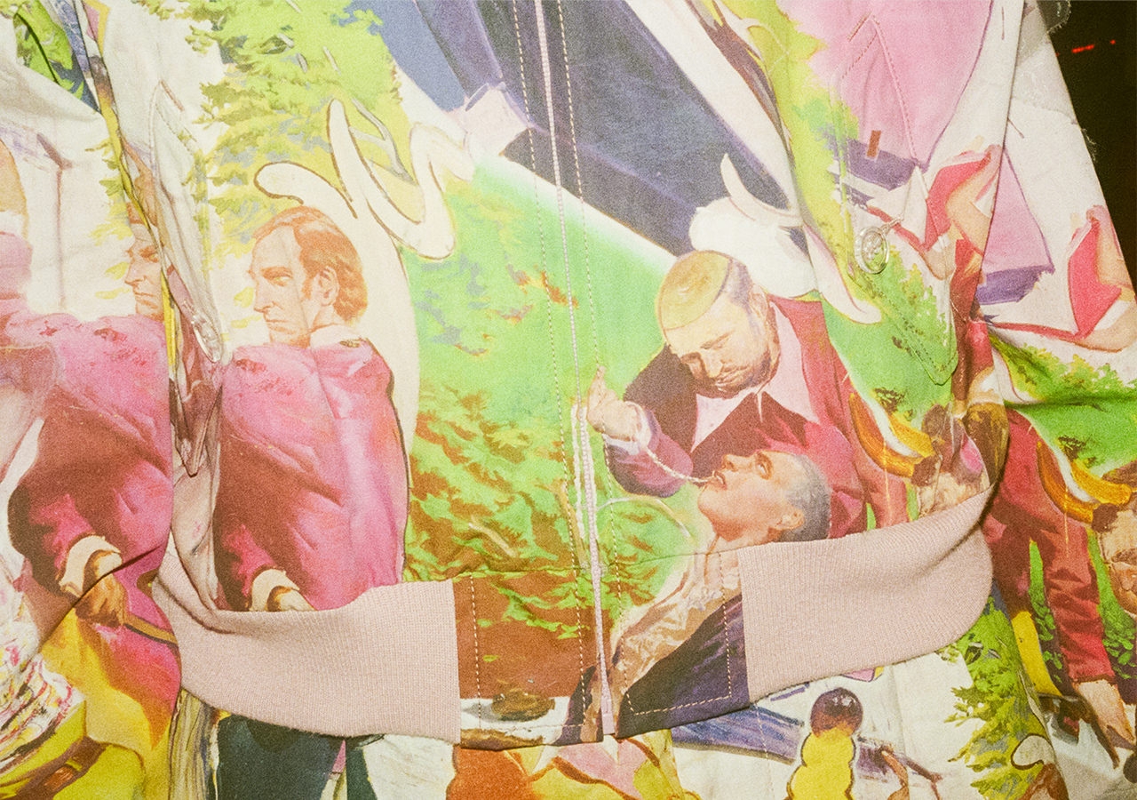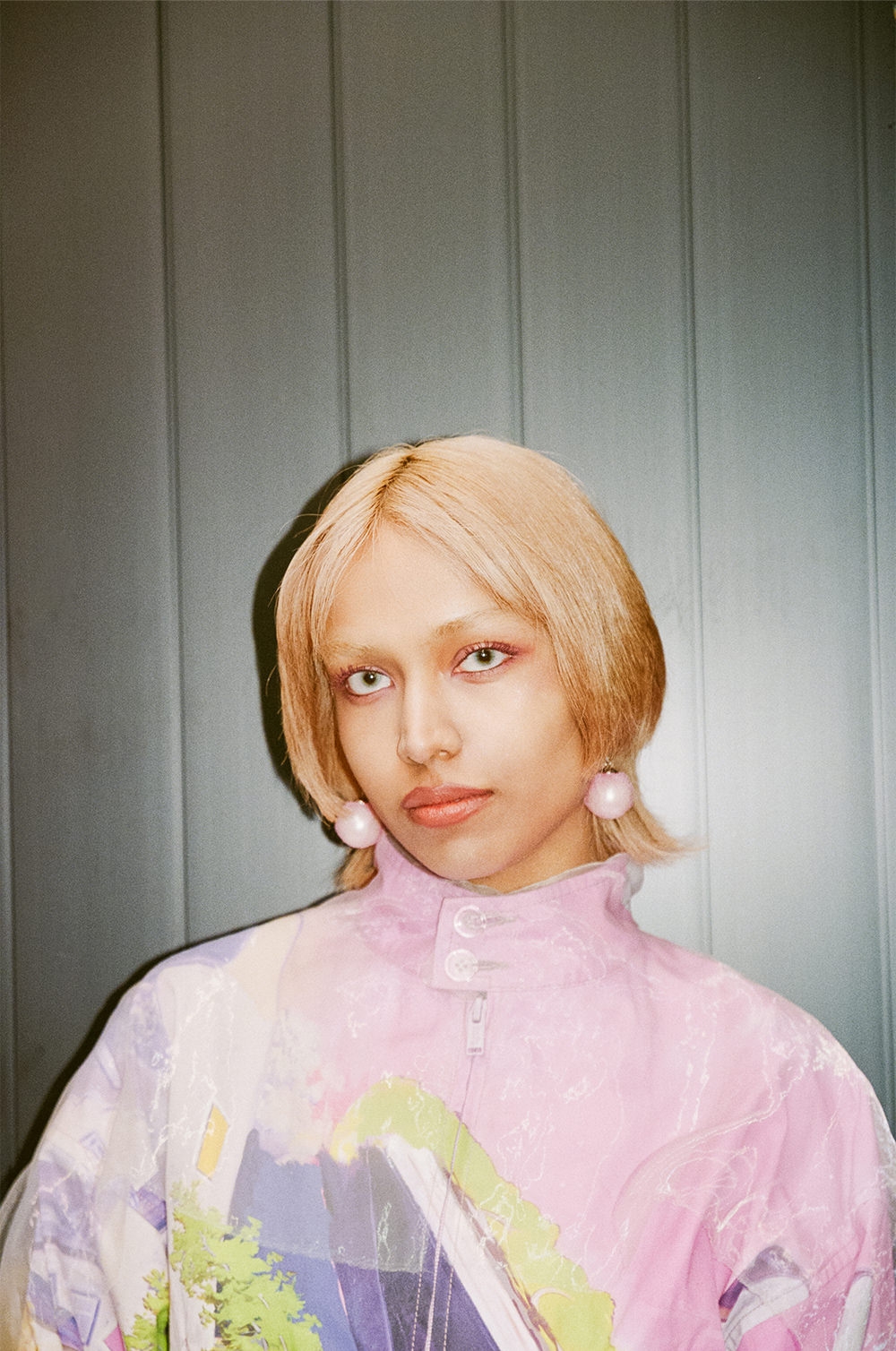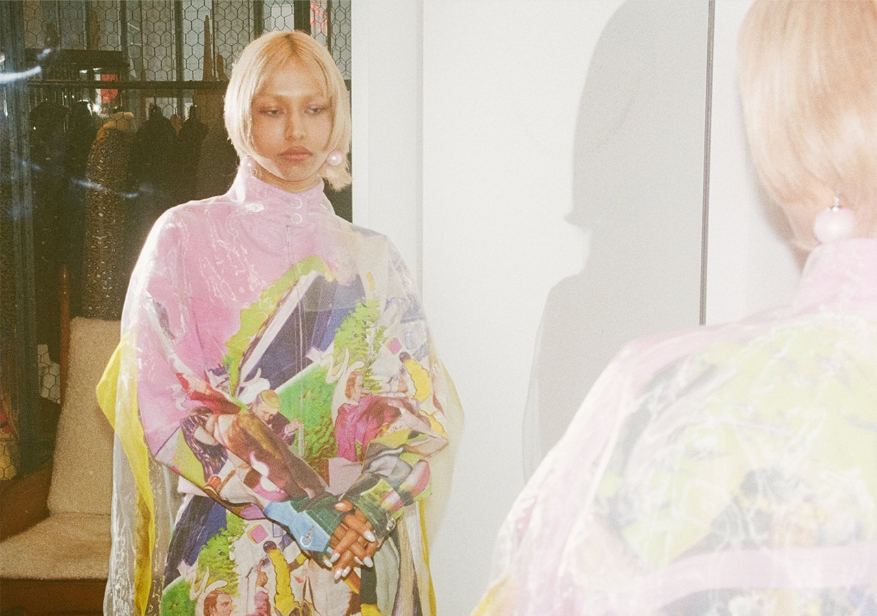 シャラさんが着用するルックは、デザイナー 高橋盾氏がかねてから尊敬していたドイツの現代アーティスト Neo Rauchの絵画を起用した春夏の新作。“Deep Mist”というコレクションのテーマが彼の世界観と共鳴し、初めてのコラボレーションが実現した。