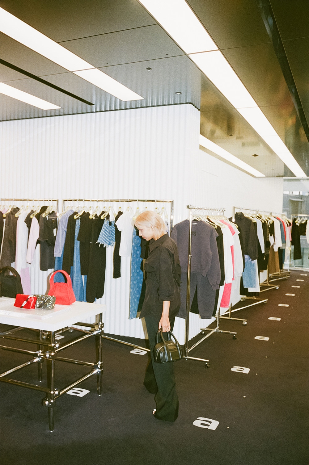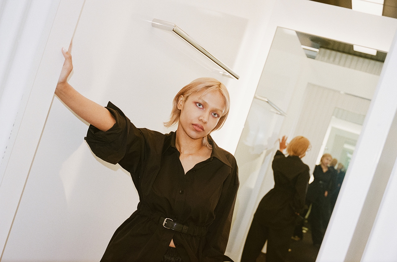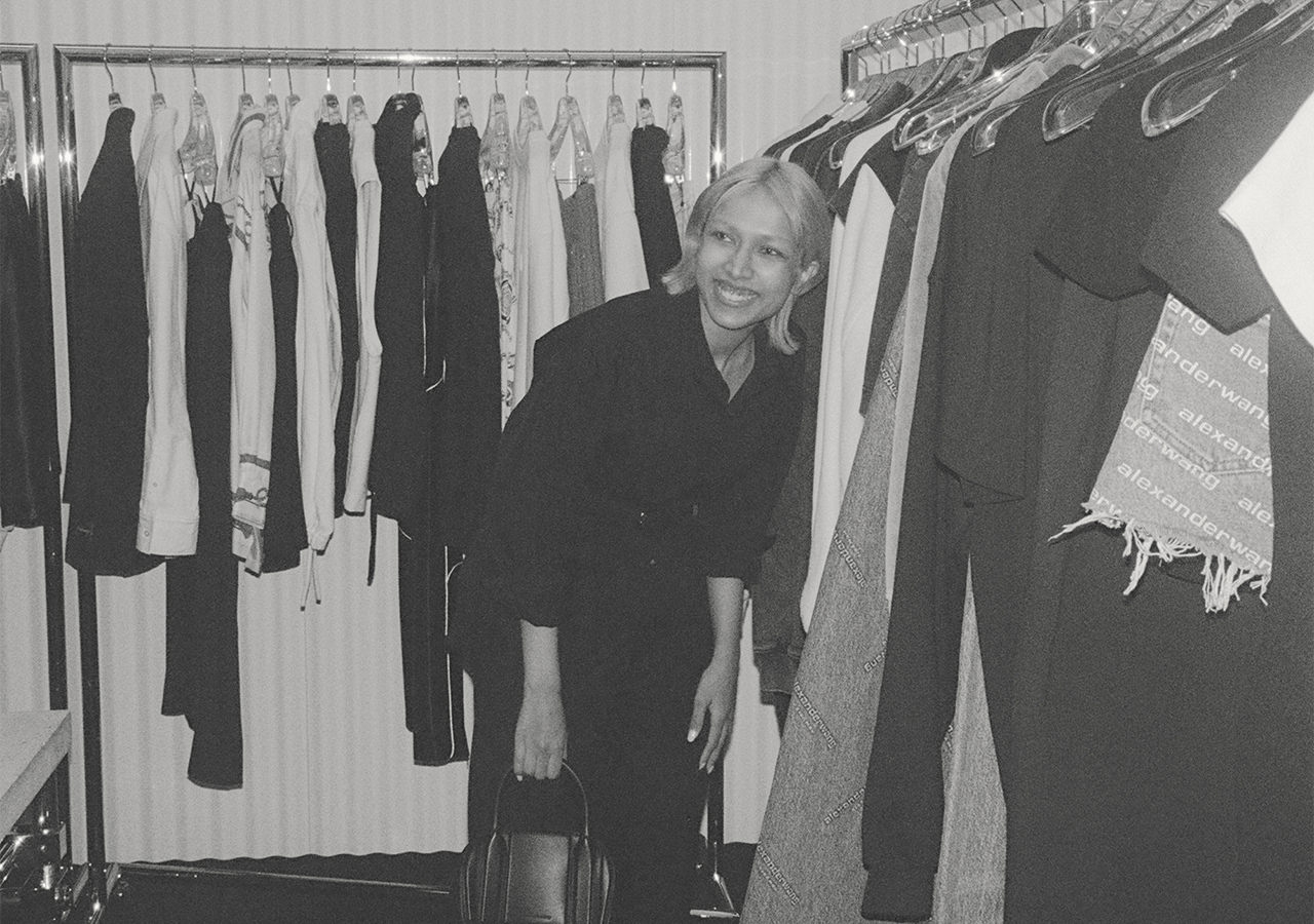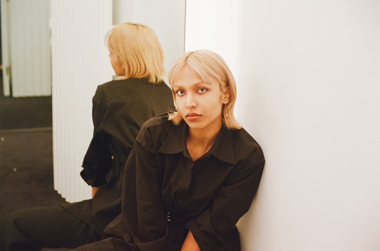 金髪に染めたヘア、カラーコンタクトをした青い目が印象的なシャラ ラジマさん。容姿からは自身の人種が判断できないようにすることで、「私は何人でもない」というコンセプトのもと、人種のボーダーレスを表現している。時代とともに変化する価値観を見事に表現者として体現する彼女は、まさに今を生きる“アルファウーマン”。シャラさんと一緒に、「alexanderwang」が理想とする現代のアルファウーマンに似合う、最旬のエッセンスを探しにショップクルーズ。