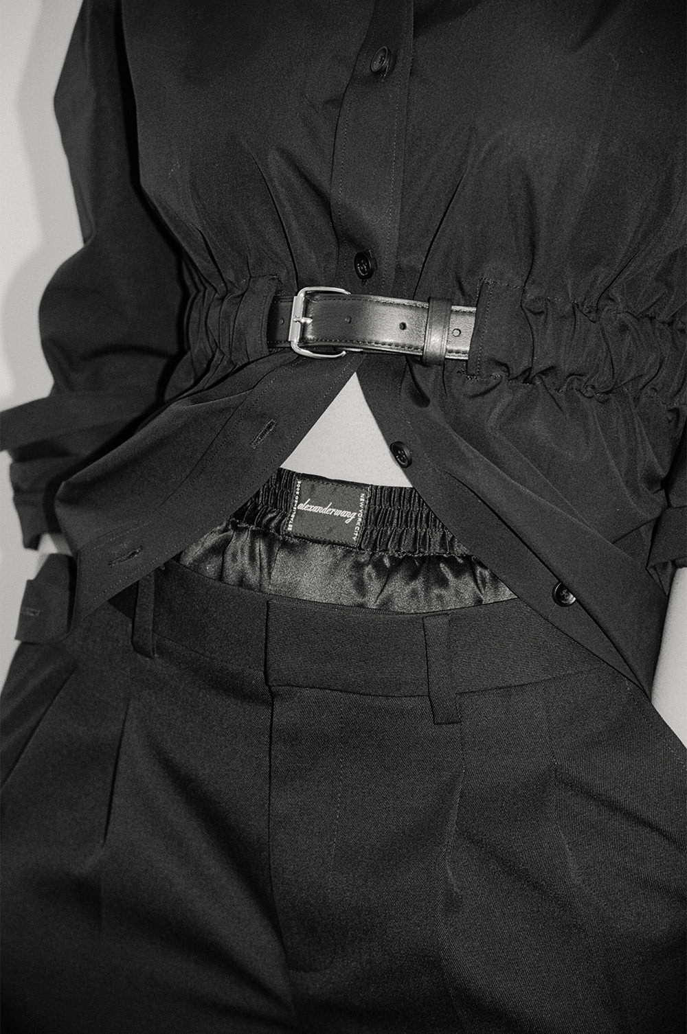 女性らしくありながらも、フロンティア精神にあふれる力強く魅力的な“アルファウーマン”を女性像として掲げる「alexanderwang」。シャラさんが纏ったオールブラックのスタイルにも、強さと洗練を香らせるアルファウーマンらしいアンビバレントな美しさが宿る。フロントにレザーベルトのアクセントが付いたルースフィットなシャツはシャーリングが施され、袖を通すだけで洗練されたスタイルを作ってくれる。アンダーウェアとドッキングされたようなデザインのテーラードパンツは、ドレスアップにもドレスダウンにも着回し可能で、日中から夜と多様なシチュエーションで自分らしく楽しむことができる。