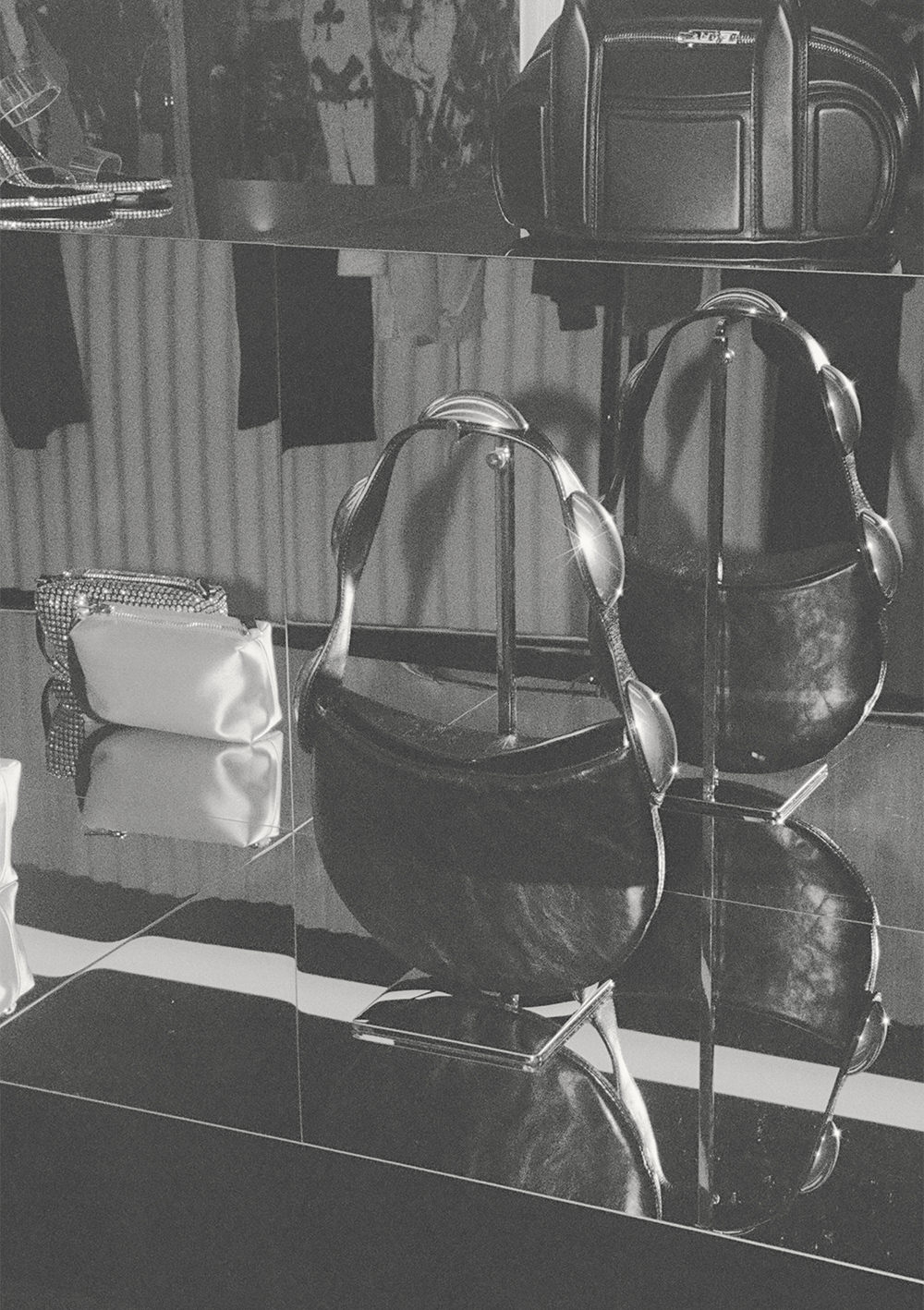 (左)dome 105 ウォータースネーク ストラッピースライドサンダル ¥132,000、(右)roc ラムナッパレザー スモールバッグ ¥132,000