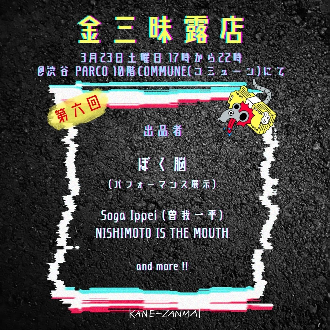 アーティストがオリジナルグッズや実験的な商品を開発・販売するプロジェクト「金三昧 KANE-ZANMAI」によるフリーマケットが開催。アーティスト・ぼく脳によるパフォーマンス展示も必見だ。随時参加者も増えるので、SNS(@kanezanmaicp)をチェック。