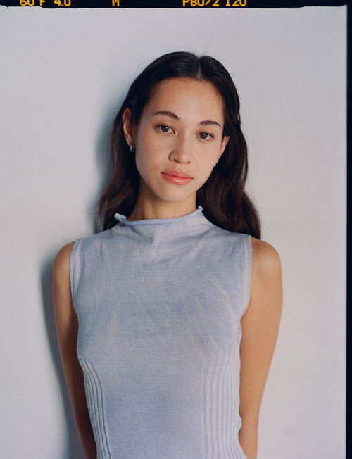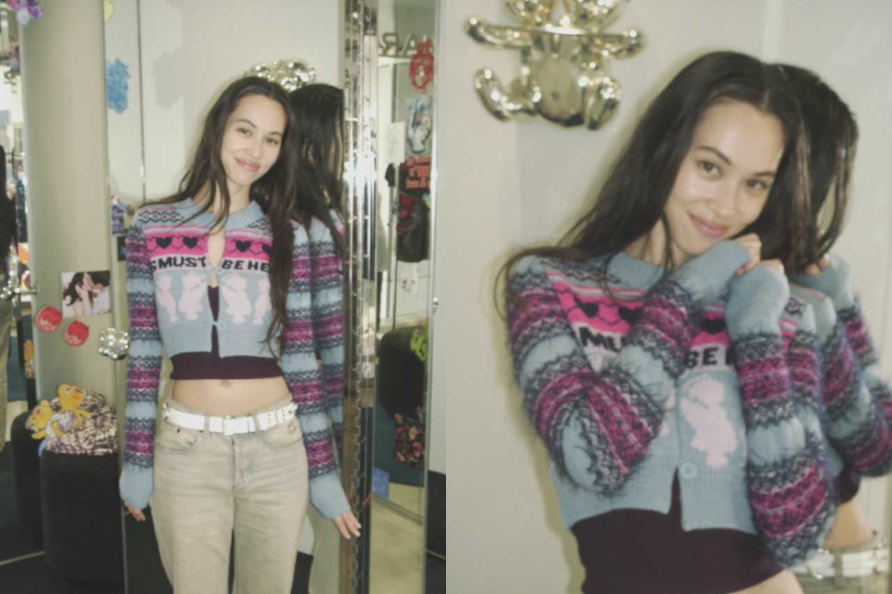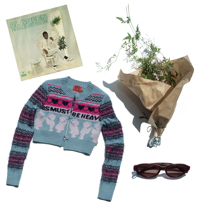 「Heavenのディレクターと交流があり、私のブランドの一つであるOKのアイテムもLAにある Heavenのお店で取り扱われているので、クリエイティブ面で共感することも多いんです。このカーディガンはフィット感がちょうどよくて色使いも絶妙で、スタイリングに加えることで気分をあげてくれると思ったのでセレクトしました。」- 水原希子