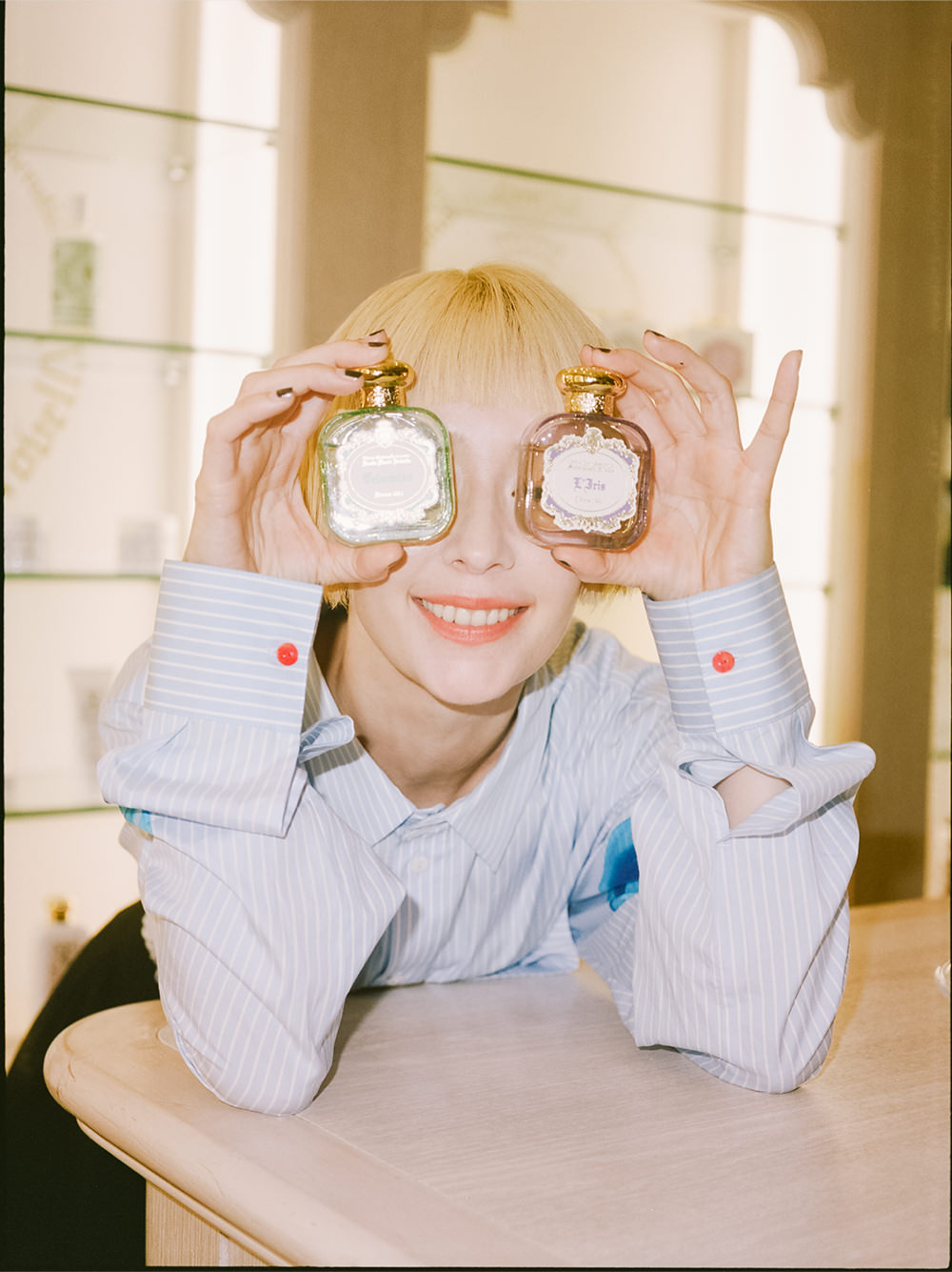 「香りには力がありますよね。気分も確実に変わる。脳のどこかで小さく閉じていた部分に、まるで風船に空気が入ったみたいにパッと広がる感じ。そう、どこか感覚が開き出すような感じがあるので、気持ちを変えたいときや、仕事に行くときにフレグランスをつけるとスイッチが入る気がします。店内で気になったのは、オードパルファム。ボトルのカラーが飴玉みたいにきれいな紫や黄色で、見ているだけでも美しくて」。Santa Maria Novella初となるオードパルファムコレクションの香りはルネサンス期のフィレンツェ名家、メディチ家の歴史と関わりのある植物のビッザリア、アイリス、マグノリア、ジェルソミーノの4種を表現している。