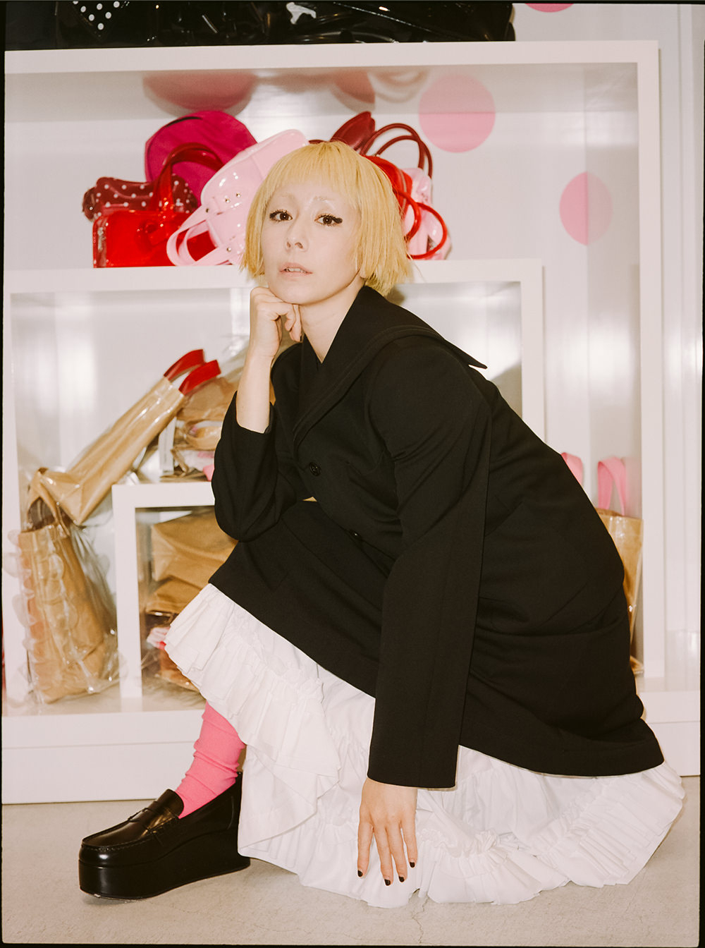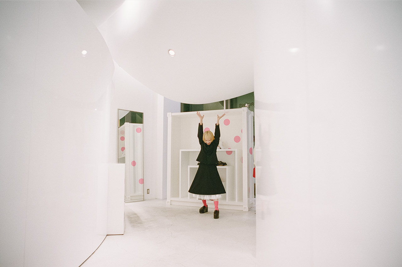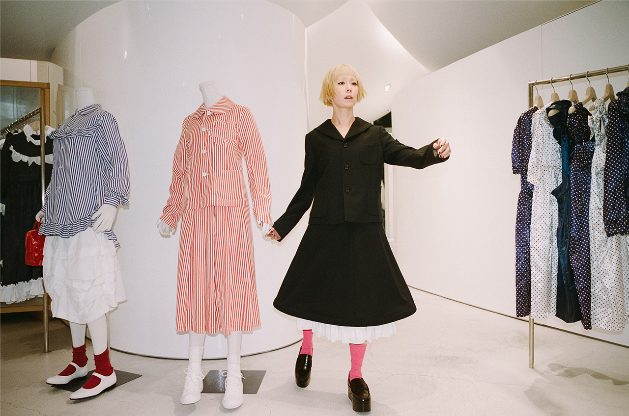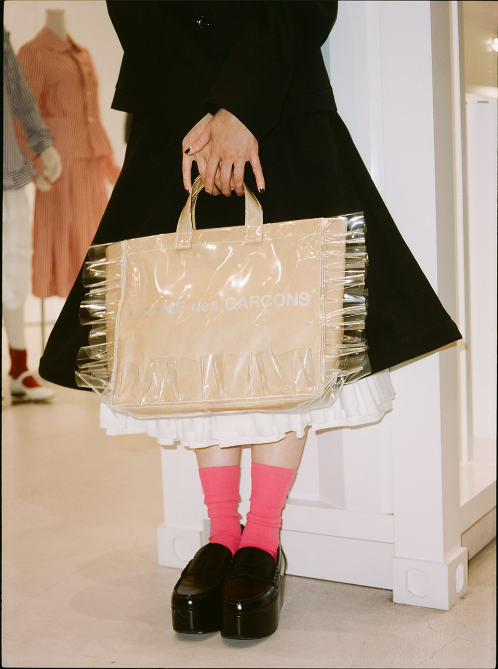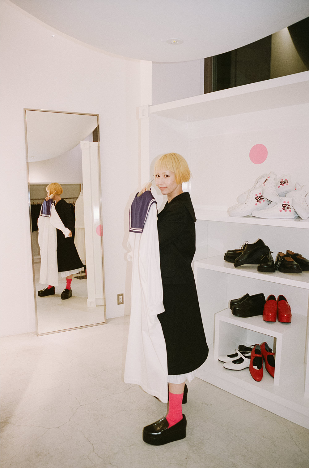 渋谷PARCO1Fにある公園通り沿いのこちらのショップは、定番から限定品までが一堂に会した「COMME des GARÇONS GIRL」初の単独店。白を基調としたクリーンな店内の天井を見上げると、大きな球体があしらわれ、訪れる人を真っ白な雲で優しく包み込んでくれるような、ドリーミーな気持ちへと誘ってくれる。渋谷PARCO店では、“COMME des GARCONS GIRL SPECIAL”と題した店舗限定アイテムを豊富にラインナップ。なかでも注目したいのは、カエラさんが持つ「PU フリルバッグ」。「COMME des GARÇONS GIRL」らしいフリルの要素を、メインコレクションでもお馴染みのポリウレタン素材のバックに取り入れ、軽快でフェミニンな印象に仕上げている。