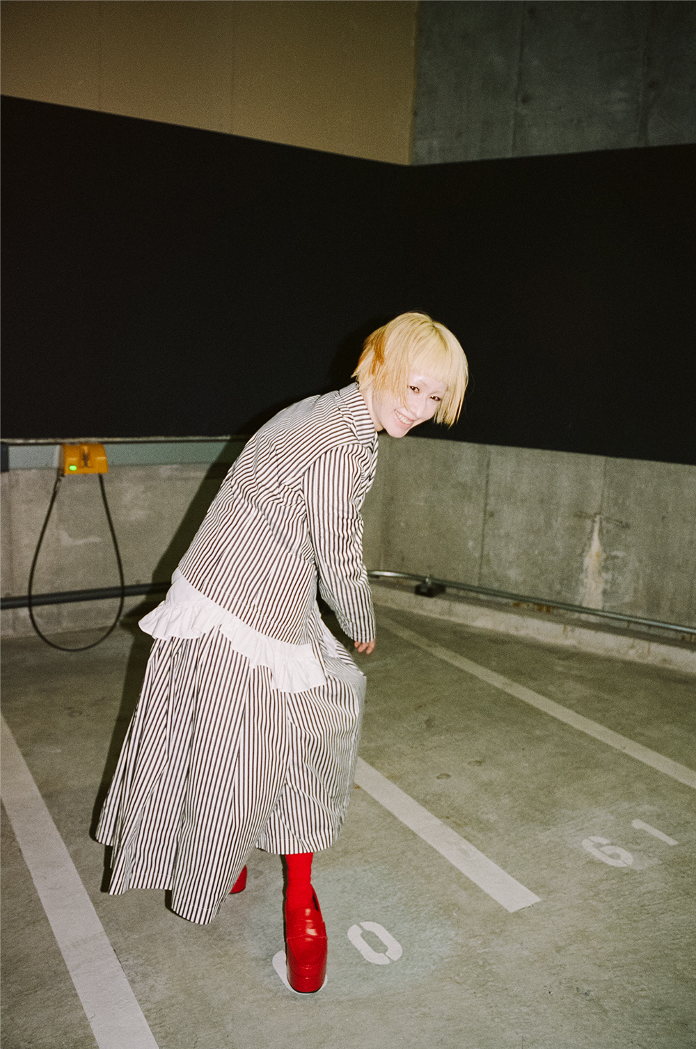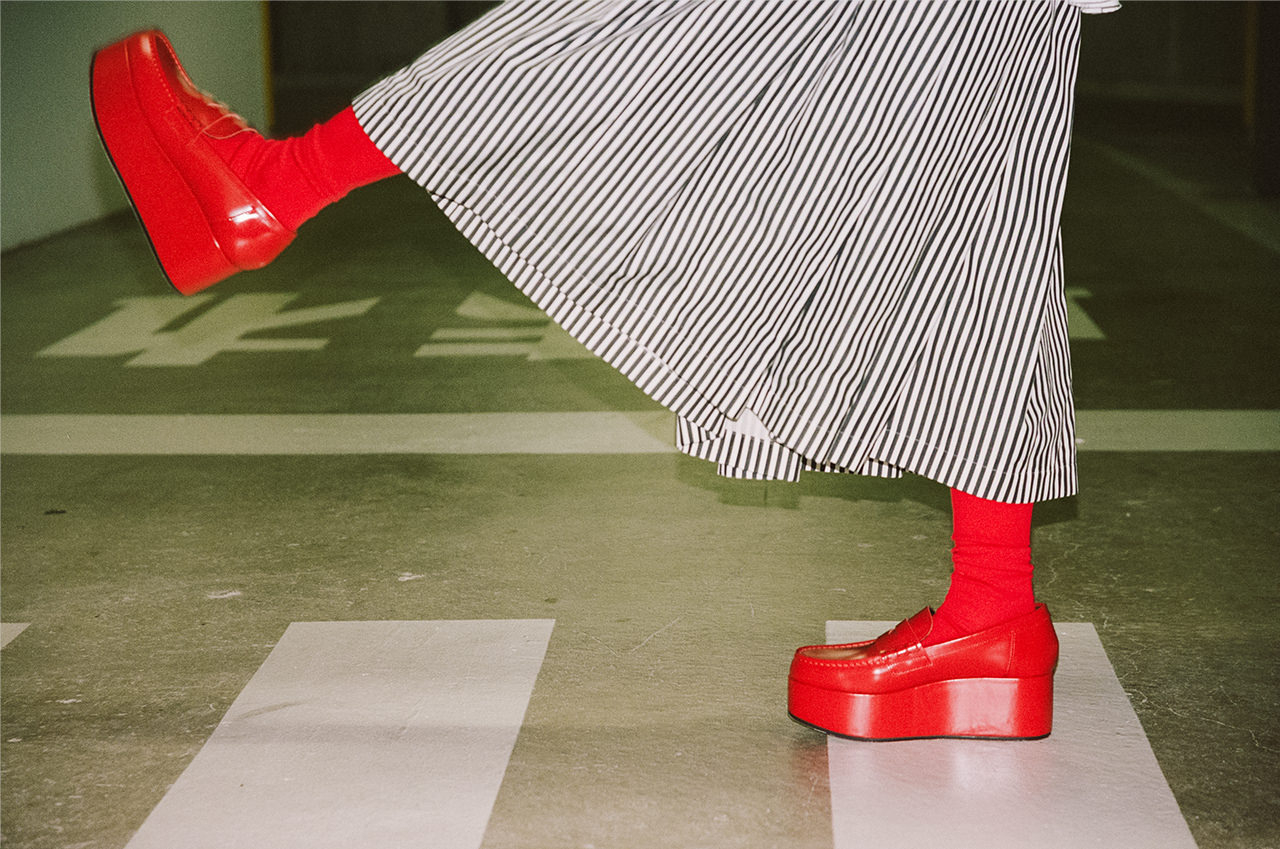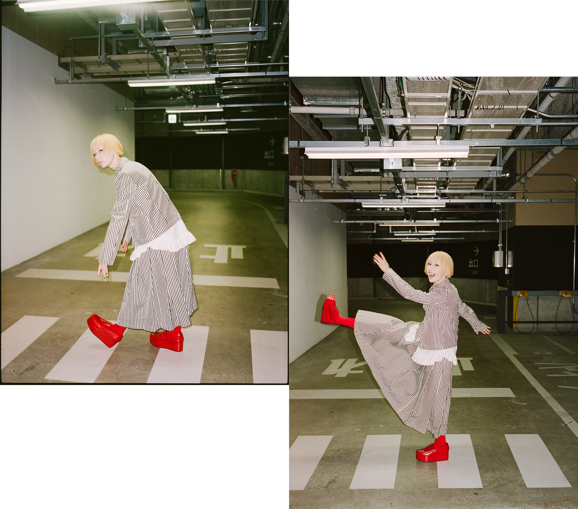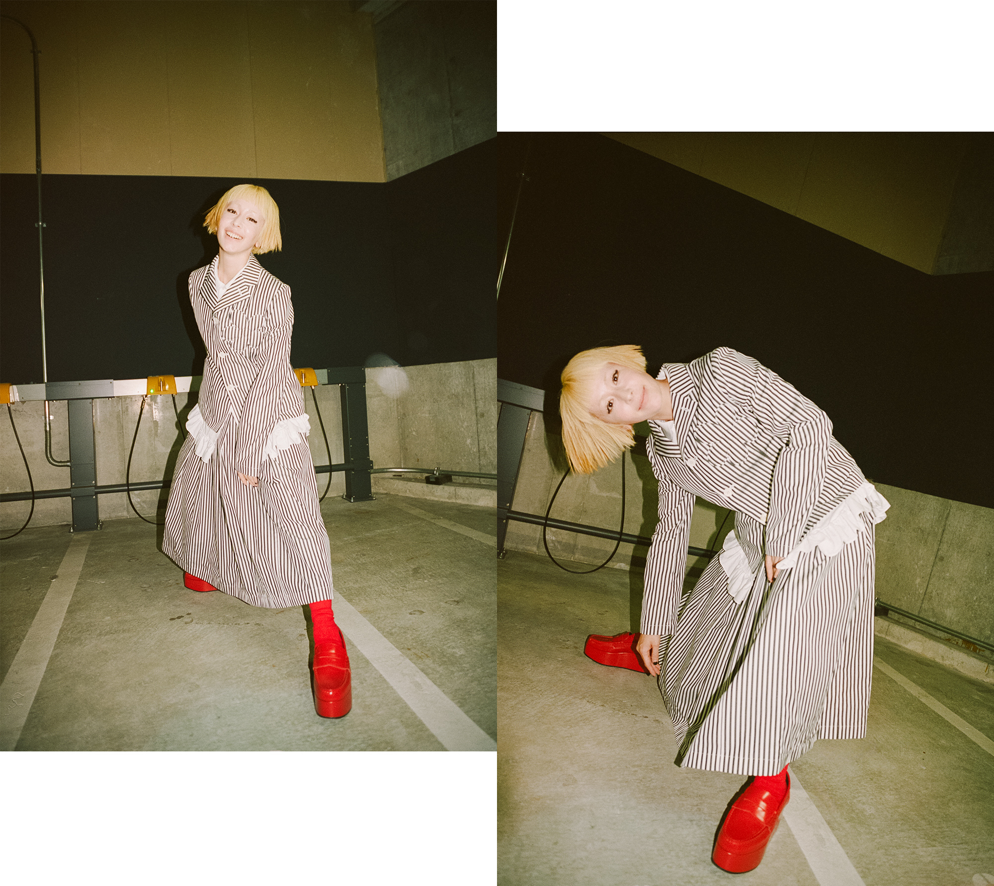 「COMME des GARÇONS GIRL」の永遠のテーマであるスクールガールスタイルをアップデートさせたストライプのセットアップも24SSの新作。カエラさんらしい、ヴィヴィッドな赤の厚底ローファーをスタイルのアクセントにチョイスした。