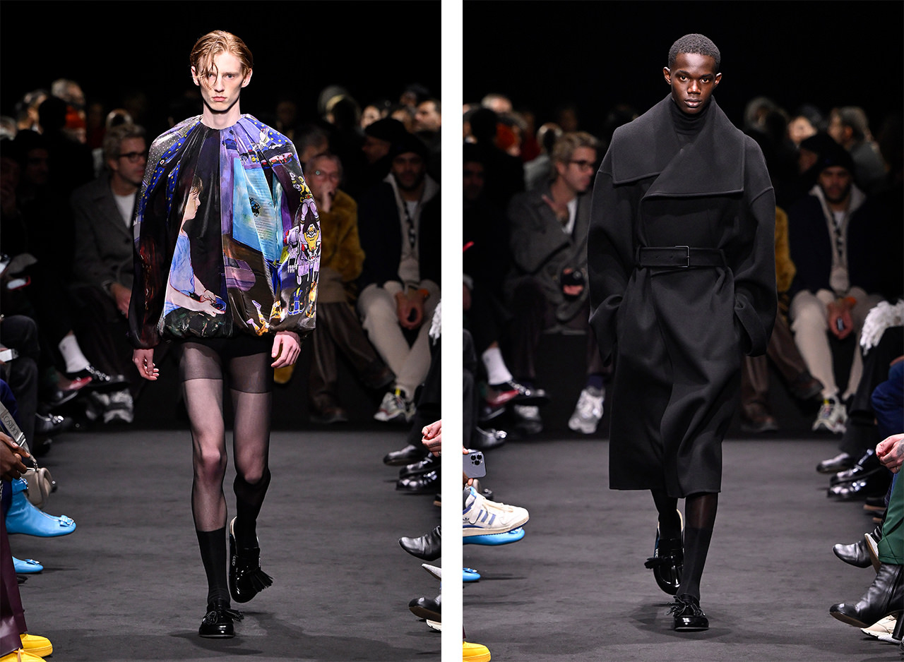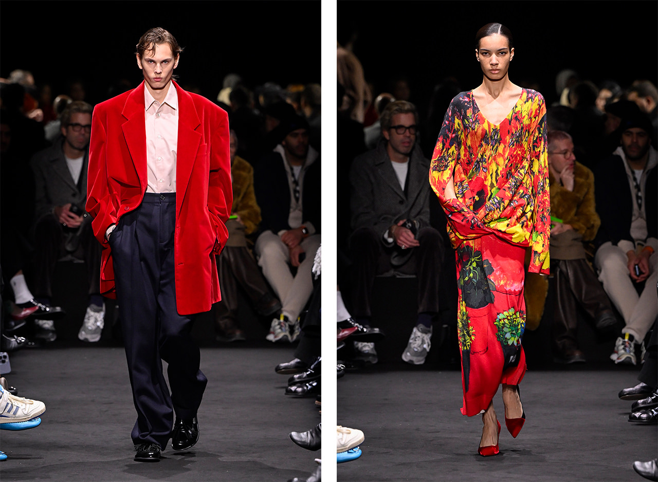 初めて映画からインスパイアされたという24AWコレクション。スタンリー・キューブリック監督の遺作『EYES WIDE SHUT』に登場する、絵画やカーテン、ポインセチア、赤色などのエッセンスがコレクション全体に印象的に落とし込まれている。規格外のビッグシルエット、歪んだスリーブのシャツ等が映画の倒錯的な雰囲気を、なめらかな素材のコートやタキシードシャツ等が作品の艶やかな雰囲気を醸し出す。