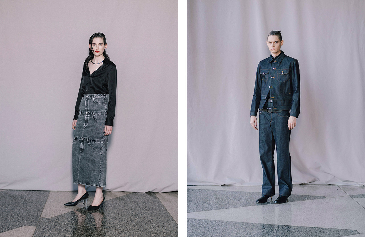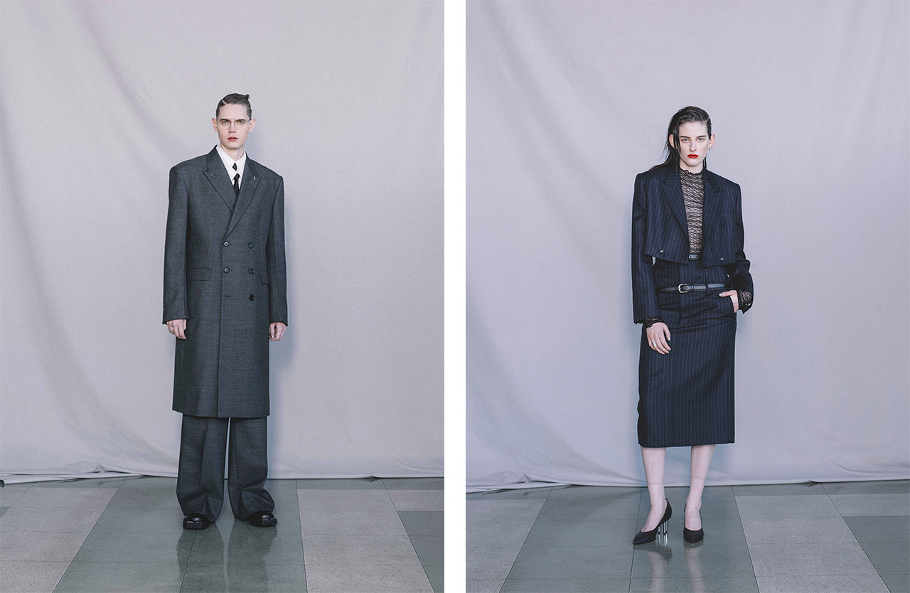24AWでは、モダニズム建築を代表するルートヴィヒ・ミース・ファン・デル・ローエが生み出した建築物や家具をはじめ、ドナルド・ジャッドによる「Stacks」作品や、数々のスタッキングチェアに着目し、メンズ&ウィメンズウェアの随所に機能美と直線美を内包する「スタッキング」の表現方法を取り入れた。また、アルネ・ヤコブセンのアントチェア、シャルロット・ペリアンのレザルクチェア、マルセル・ブロイヤーのワシリーチェアといった歴史的家具に潜むディテールやテクスチャーをコレクション内に散りばめた。レースのカットソーやヒールシューズをスタイリングし、より力強くアンダーグラウンドな世界観に。