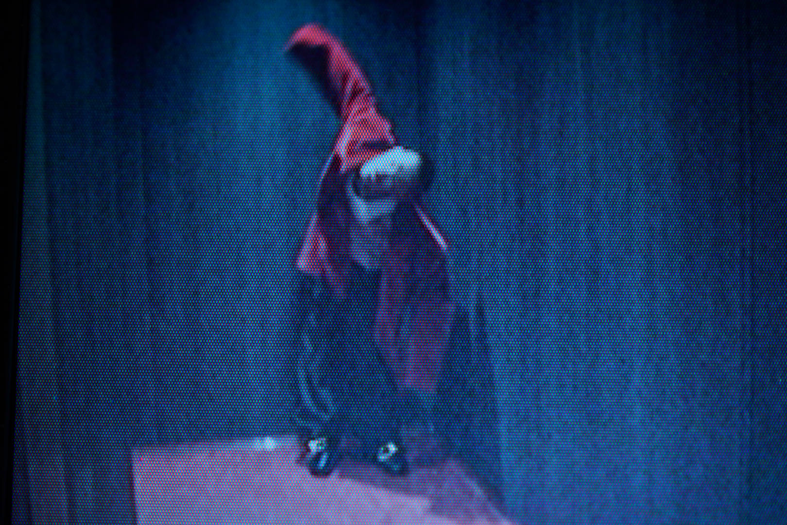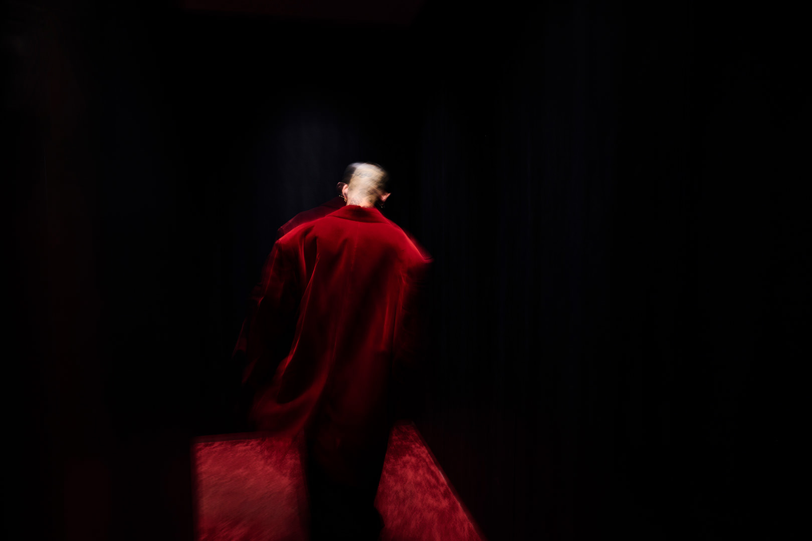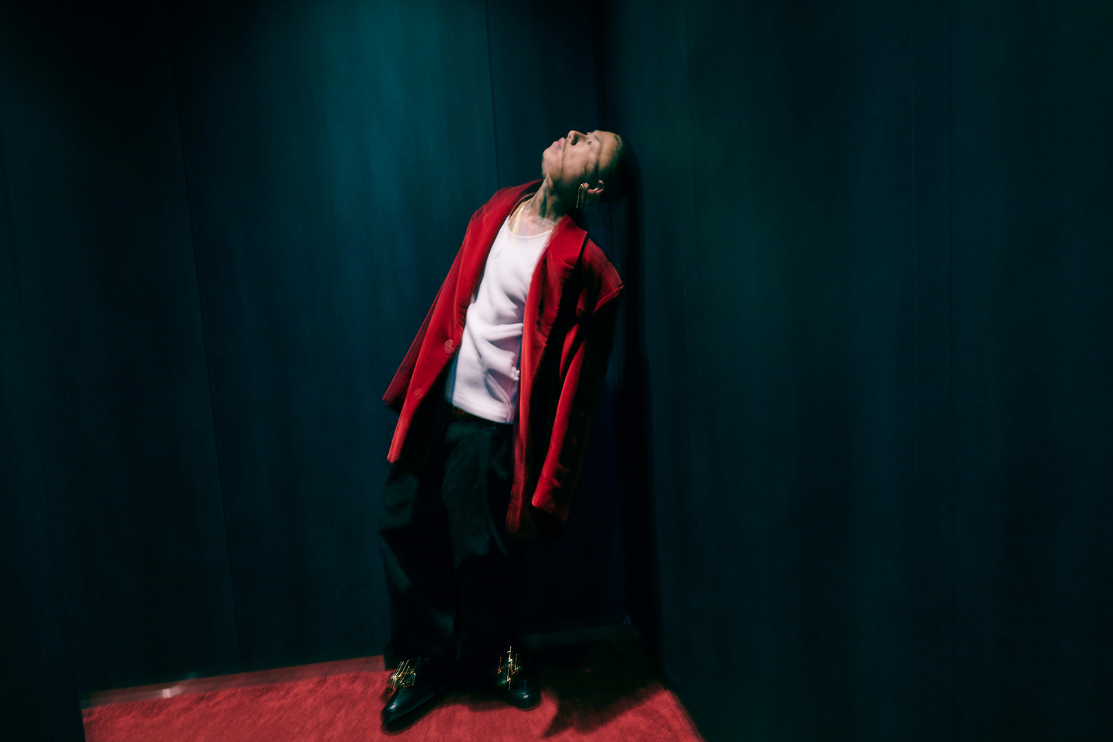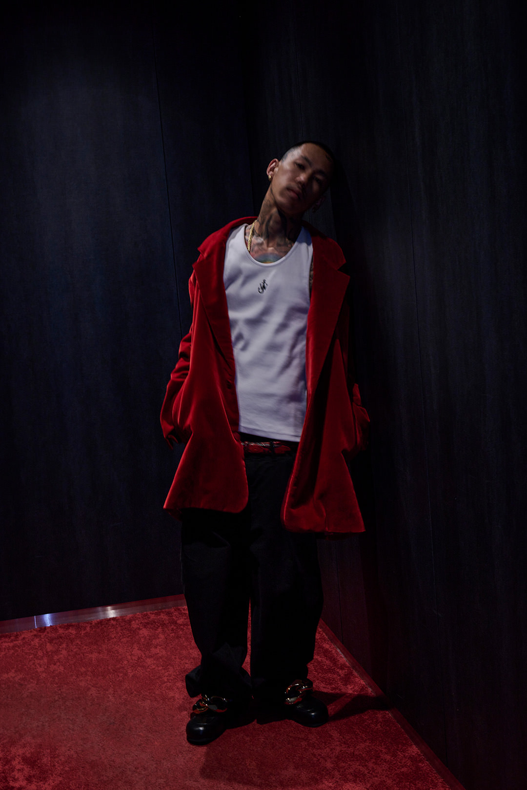 千葉雄喜さんが着用するオーバーサイズのダブルジャケットは、「JW ANDERSON」の今シーズンを象徴するルックのひとつ。映画のインテリアで印象的に使用している赤を、カーテンやソファなどクラシックな内装を想わせるベルベットのファブリックで掛け合わせた。一見、伝統的な紳士服のようでありながら、どこかロンドンのパンキッシュなカウンターカルチャーも漂わせるJW ANDERSONらしい自由な雰囲気の一着となっている。