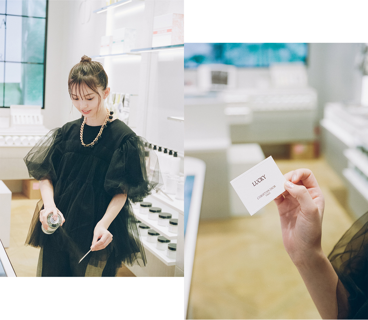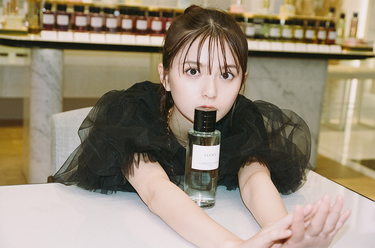 「クリスチャン・ディオールがお守りとしてポケットに挿していたスズランが『ラッキー』という香りになったと伺い、その物語がとても素敵だなと思いました。私は爽やかな香りが好きで、白い花々の後ろからスズランの繊細な香りがほのかに香り立つこのフレグランスが、とても好きになりました。幸運を味方につけられるような名前もいいですよね」と齋藤飛鳥さん。