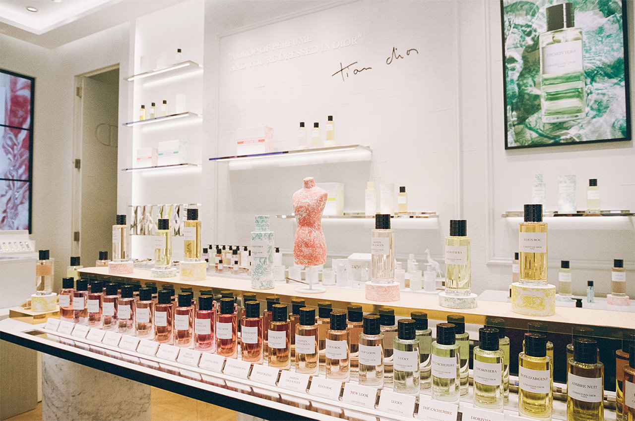 DIOR BEAUTY SHIBUYAの「メゾン クリスチャン ディオール」のコーナーでは、メゾンの歴史と密接に結びつく、まるでオートクチュールのように原料にこだわった贅沢で繊細な香りを放つ22種類のフレグランスに出合える。ディオールを象徴する色、“ディオール グレー”を表現したシプレー調の「グリ ディオール」。クリスチャン・ディオールがショーの成功を祈り、オートクチュールドレスの裾に縫い込んだり、自身の胸ポケットにそっと忍ばせた一輪の幸運のスズランを香りに昇華させた「ラッキー」や、彼が夏のバカンスを過ごしたニースの内陸地にある“天使の入り江”が香りの名前の由来となった「ジャスミン デ ザンジュ」など、ひとつひとつの香水にディオールの物語が宿っている。