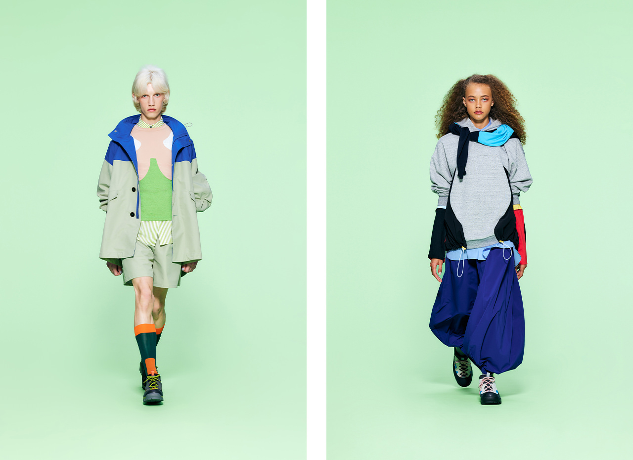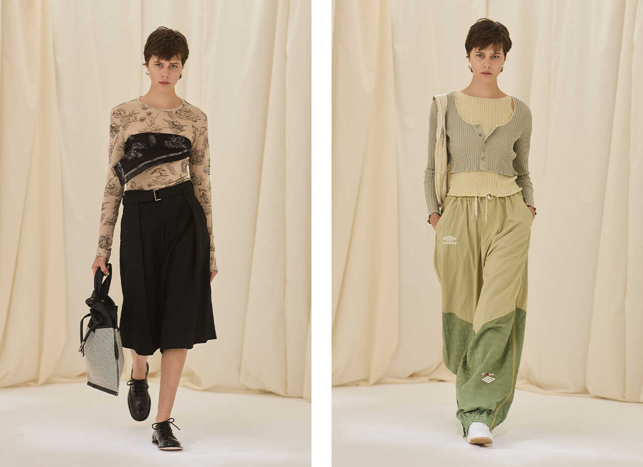 下絵やスケッチ、概念を意味するフランス語「esquisse」をテーマにしたコレクション。服の構造を下絵として捉え、固定概念に縛られない自由なパターンメイキングで新たな価値観を提案する。ややグレイがかったニュアンスカラーとヴィヴィットなカラーとの対比は、アメリカの画家マルコム・リープケの瑞々しく官能的な絵画から着想を得たもの。入れ墨のようなタッチのアロハプリントや歪んだ紙幣柄、モノクロの花柄とユニークなエッセンスを加えている。フットボールブランド「UMBRO」や映画『ジュラシック・ワールド』とのコラボアイテムにも注目だ。