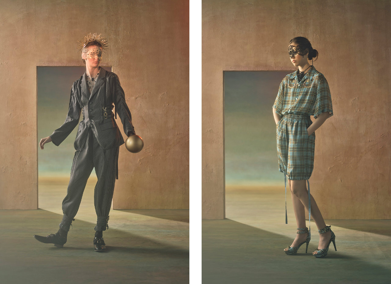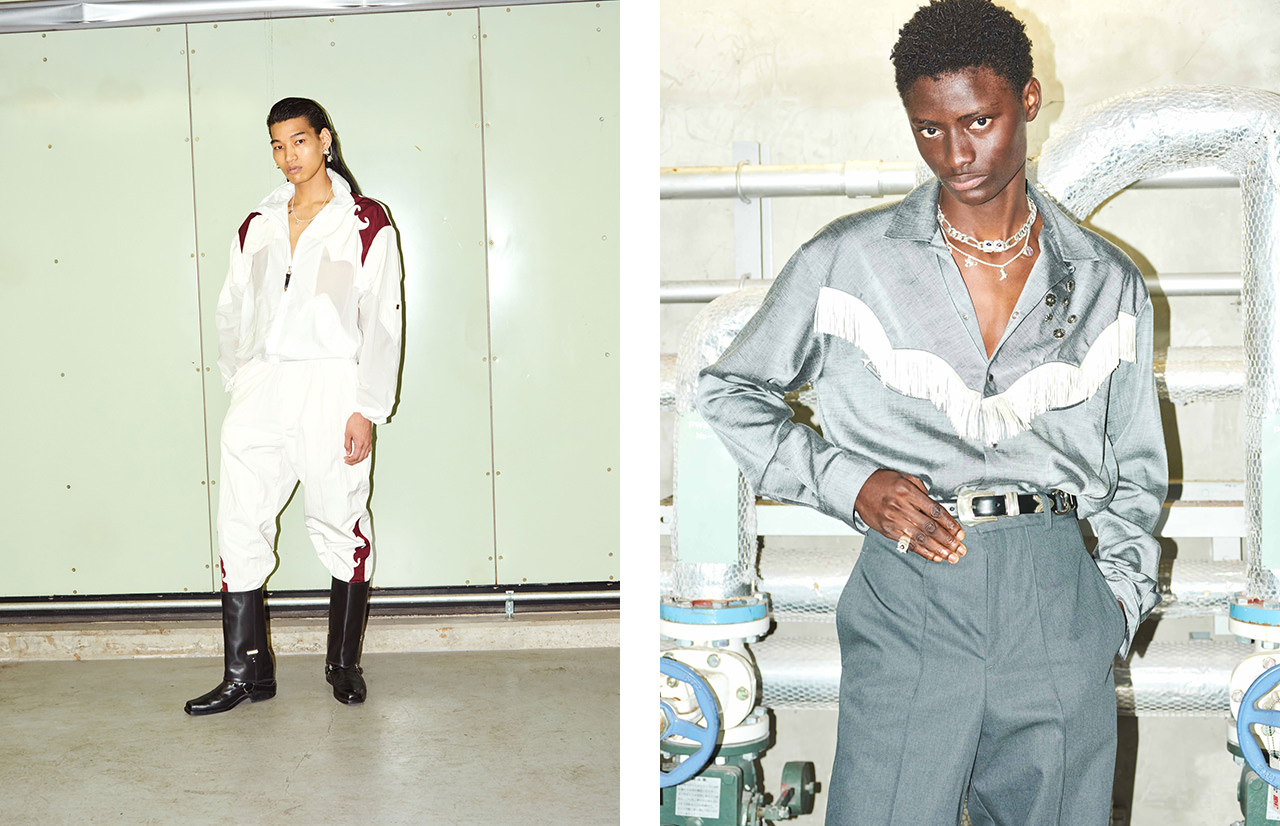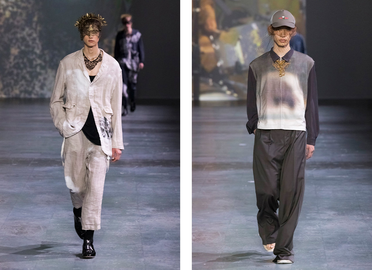 架空の民族をイメージした25SSメンズコレクションはボーダレスな世界観を演出しながら、ウィメンズ要素も取り入れ、中性的な雰囲気を漂わせる。着やすさと軽さを追求し、リネンのセットアップを展開。デザイナー高橋盾氏が描いた油彩やイタリアのペインター、ロバート・ボシシオの作品がプリントされ、アーティストの日常着も彷彿とさせる。ウィメンズは日常着にフェティッシュな要素を落とし込みツイストさせた。ボクシーなデザインを縛ることで体型に合わせたシルエットに変化させ、カジュアル且つエレガントな魅力を放つ。