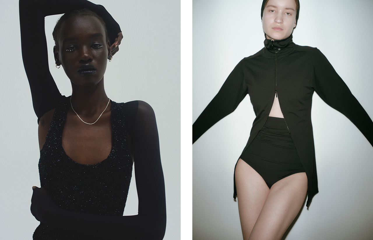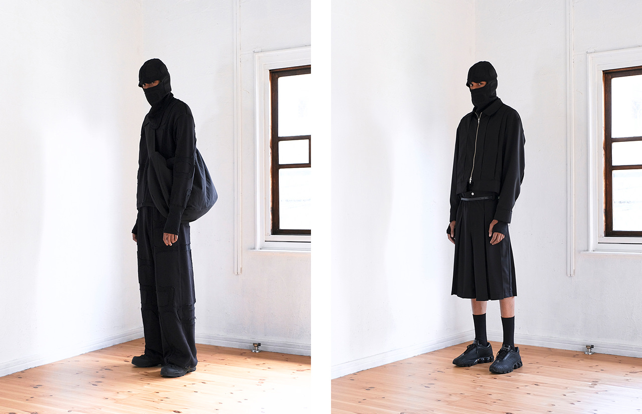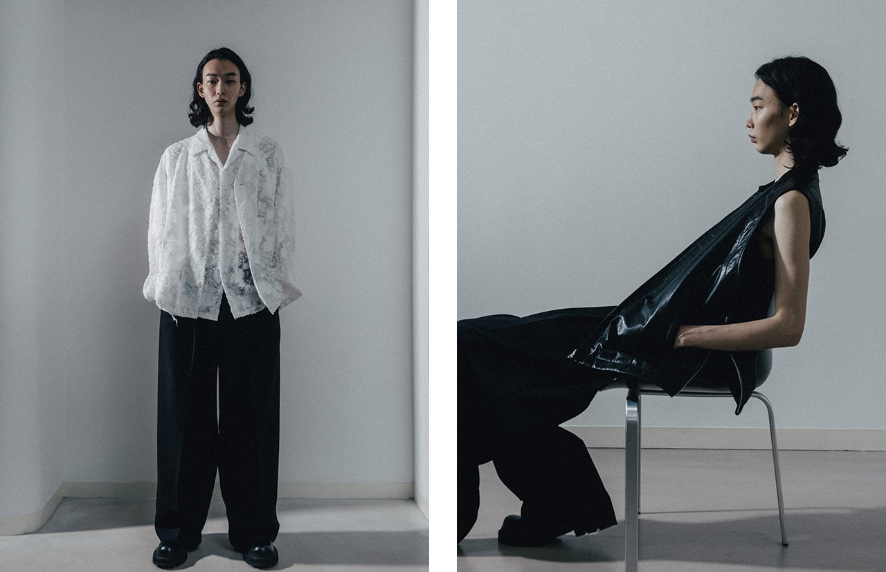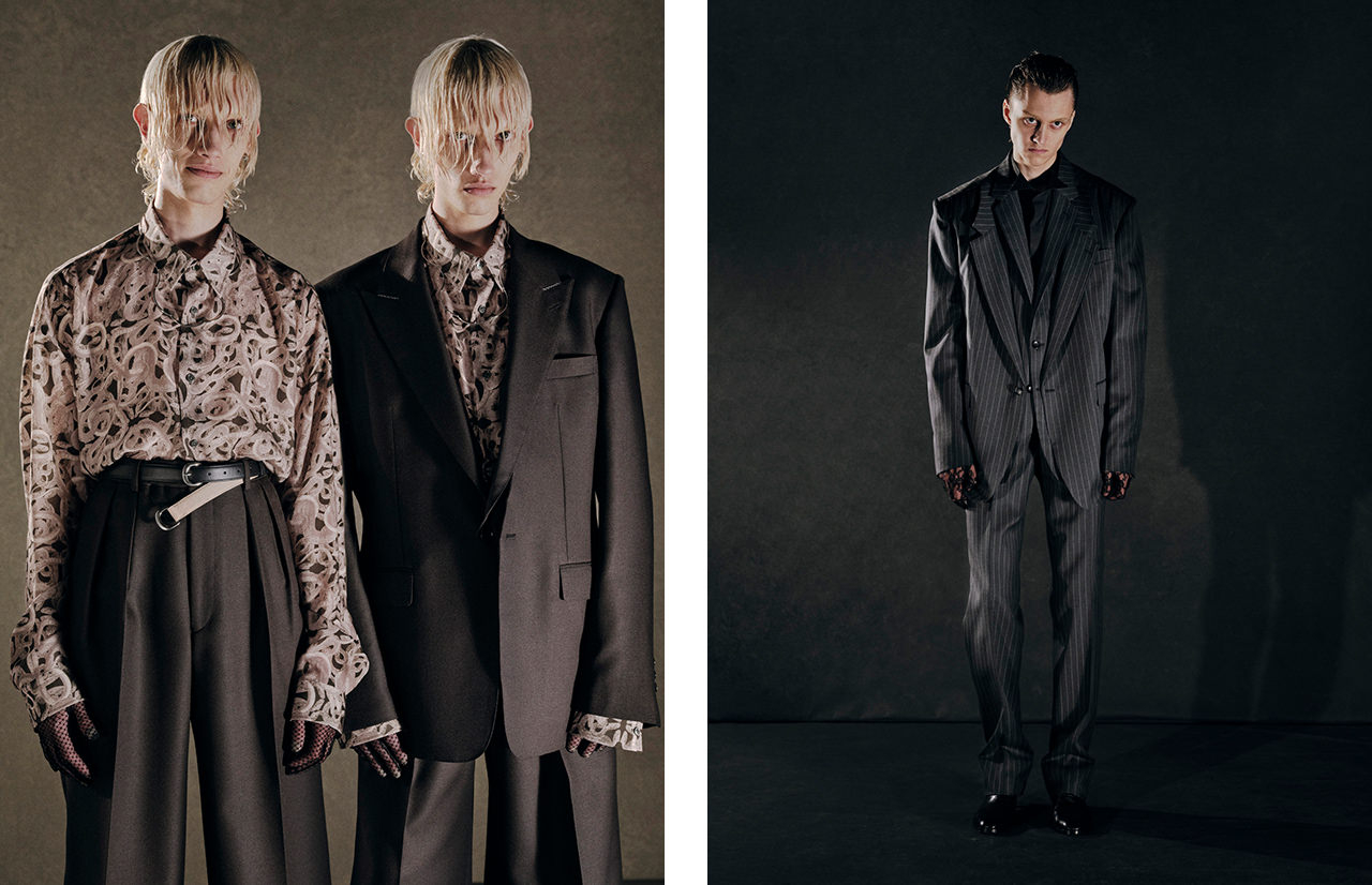 「DUALITY」をテーマに、ドッキングの手法によって、人格や服に内在する二面性を引き出した25SSコレクション。ブランドの核であるテーラードジャケットをはじめ、トレンチコート、バイカージャケット、ボンバージャケットなど、複数の服のディテールを集約してドッキングの新しい在り方を提案。トップスは一つのボディに長袖と半袖が共存していたり、トラウザーズも左右のシルエットが異なっていたり、ドッキングデザインが一着でもさまざまなスタイリングを叶えている。ウィメンズは、スパンコールやクラッシュベルベット、レースなどの素材に、ランジェリーやコルセットといったフェティッシュな要素を加え、妖艶な雰囲気に仕上げている。