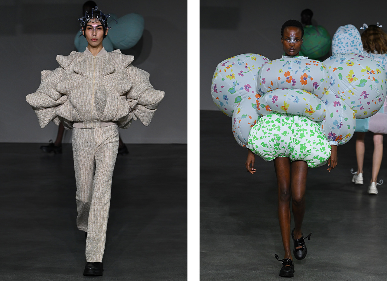 「WIND」をテーマに、目には見えない風の力を可視化し、服に命を吹き込んだ25SSコレクション。風を服の内部に送り込むことによって新たなシルエットを作り出すことを目指し、空調服とコラボレーションした。ドレープドレスは風船のように膨らみ、異生物を思わせるボリューム感溢れるシルエットが完成する。水玉柄、市松柄、千鳥柄、花柄など、多様な柄が風に乗り、重力から解き放たれたように服の表面を自由に舞う動きを描く。空気を抜くとデイリーウェアに戻り、風によって日常と非日常を行き交う服となる。2025年2月中旬より発売開始予定。