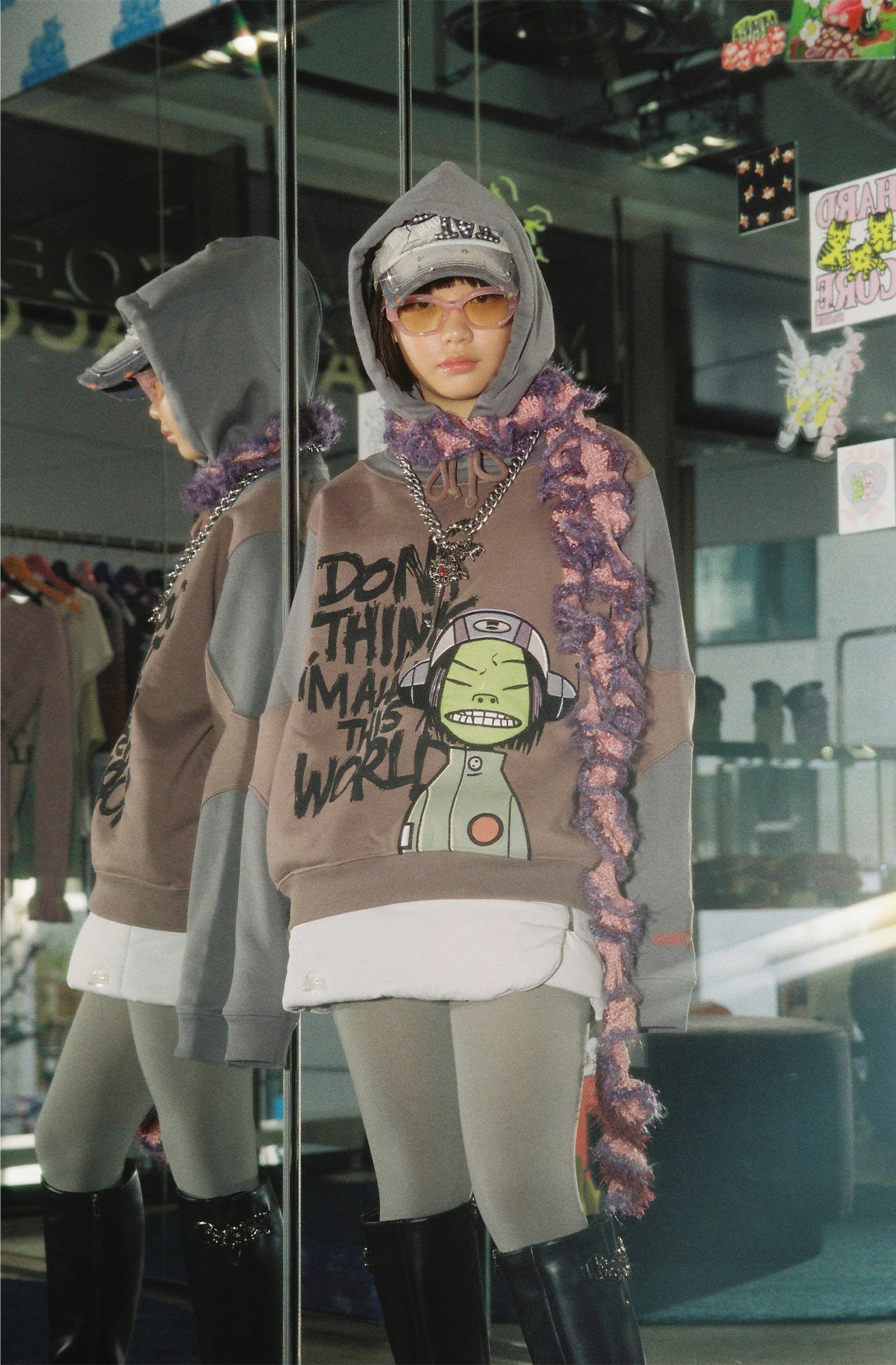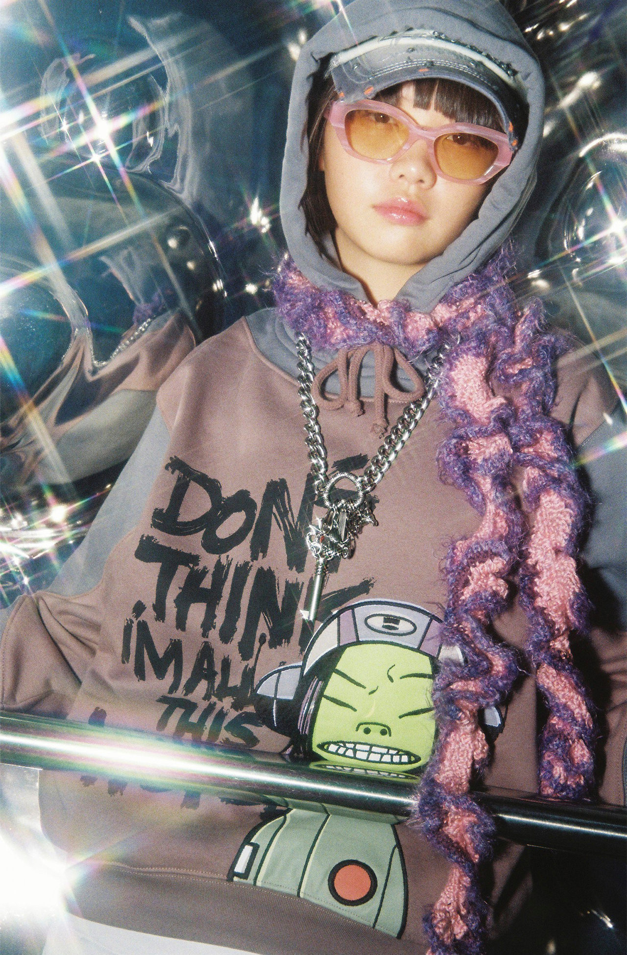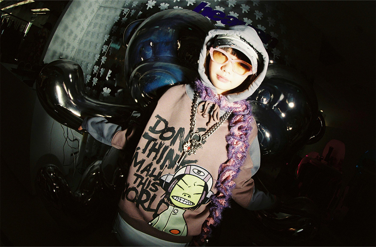 今回は、COCOさんご自身がコーディネートしたスタイリングで撮影を。Gorillazメンバーである、関西弁を話す日本人の女の子“noodle”が描かれたフーディにミニスカートを合わせ、ヴィンテージ感を漂わせるグレートーンでまとめた。