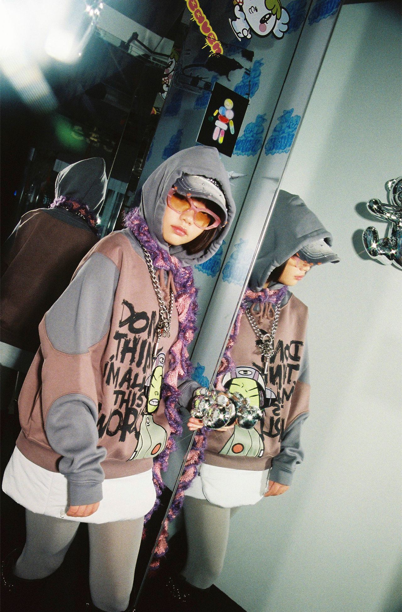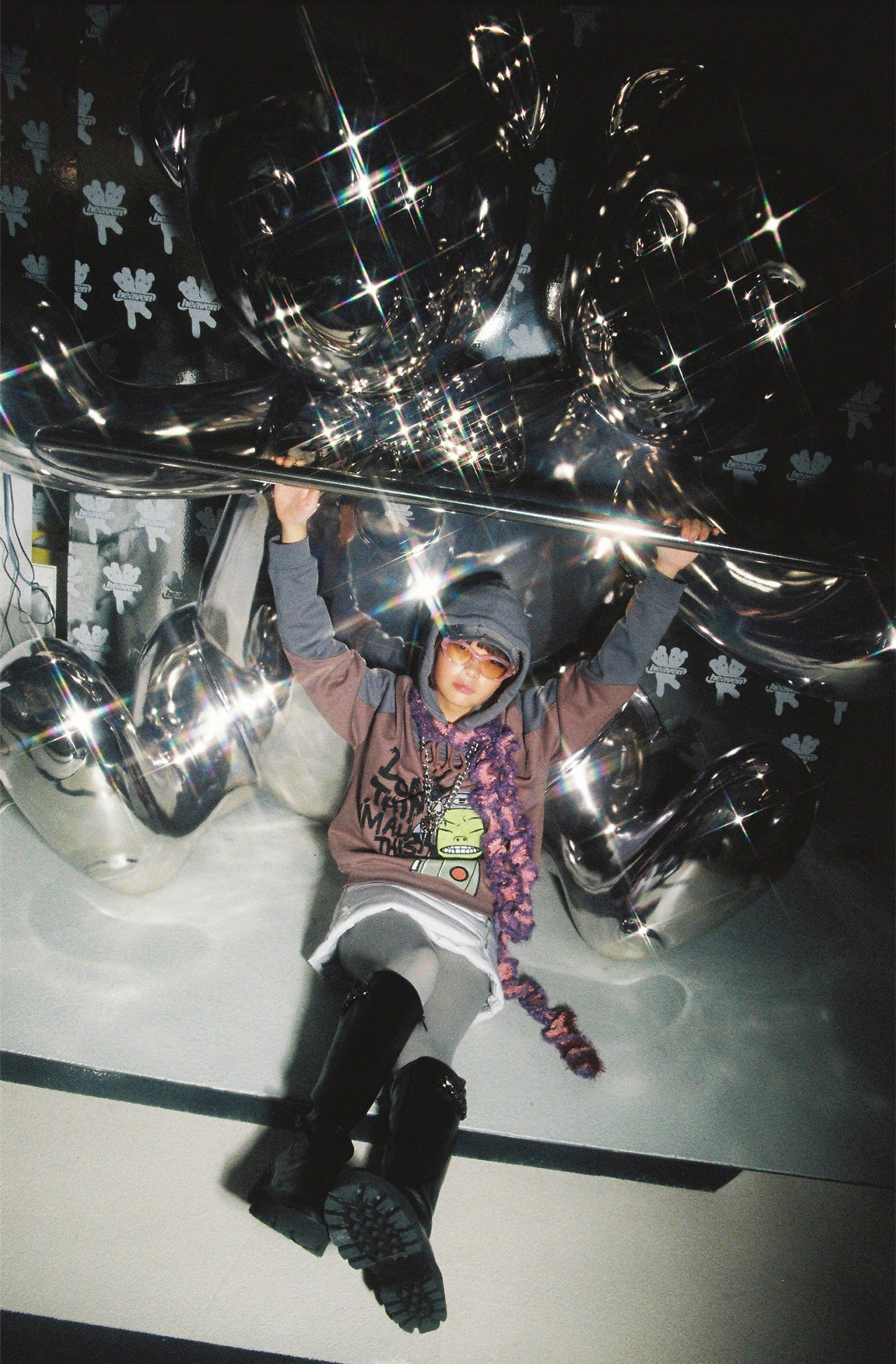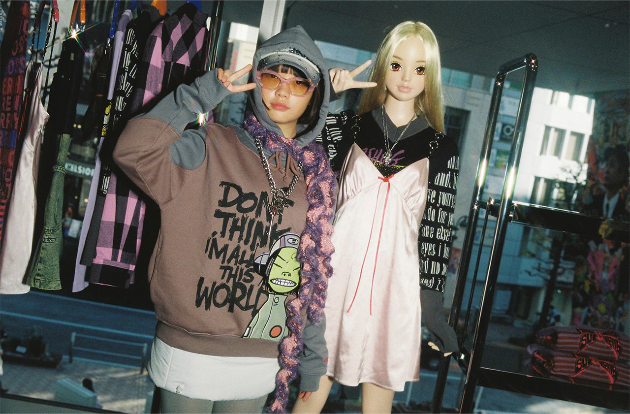 今回は、COCOさんご自身がコーディネートしたスタイリングで撮影を。Gorillazメンバーである、関西弁を話す日本人の女の子“noodle”が描かれたフーディにミニスカートを合わせ、ヴィンテージ感を漂わせるグレートーンでまとめた。