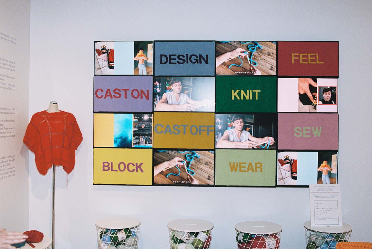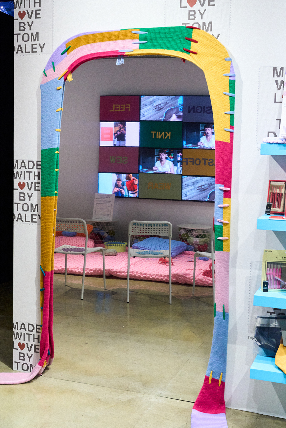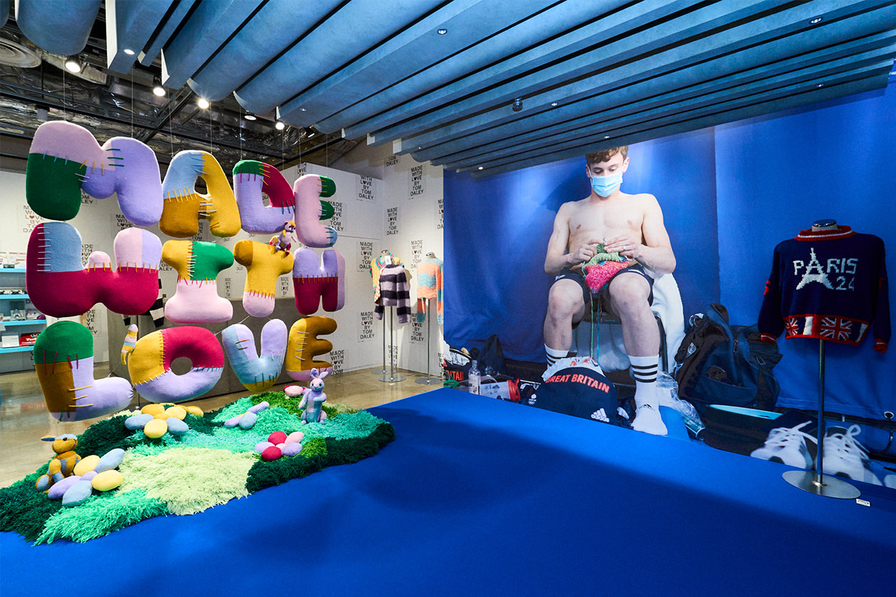 展覧会ではトム・デイリー氏がお気に入りのニット作品約20点を選び、自身が歩んできた編み物の旅路を表現。競技場の飛び込み台を彷彿とさせる空間には、東京五輪時に制作したニットとトム・デイリー氏が獲得した5つのメダルを展示。「スランプの先へ」と題するゾーンでは、天井からニットを垂らし、コロナ禍の「先の見えない不安」を表現した。展示会初日には本人による編み物のワークショップが催され、トム・デイリー氏が大切にしている「ニッティングコミュニティ」が感じられる、特別なひとときとなった。