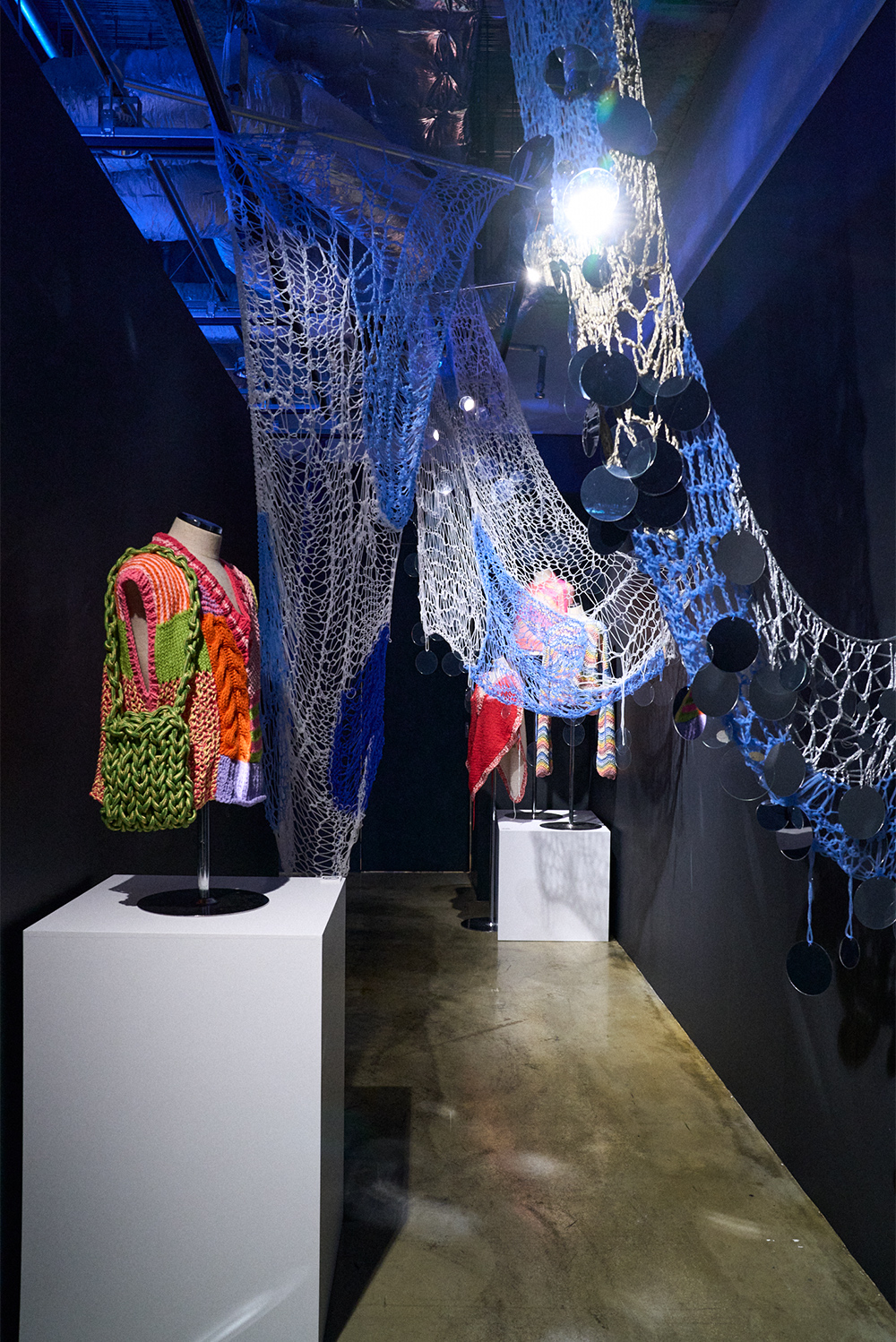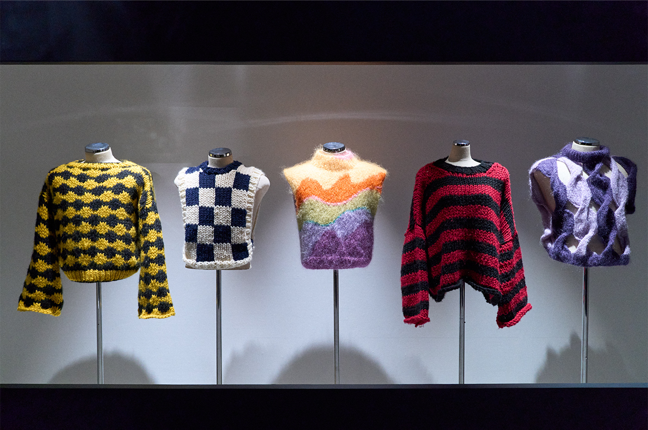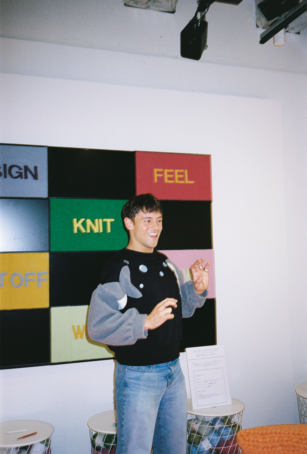 展覧会ではトム・デイリー氏がお気に入りのニット作品約20点を選び、自身が歩んできた編み物の旅路を表現。競技場の飛び込み台を彷彿とさせる空間には、東京五輪時に制作したニットとトム・デイリー氏が獲得した5つのメダルを展示。「スランプの先へ」と題するゾーンでは、天井からニットを垂らし、コロナ禍の「先の見えない不安」を表現した。展示会初日には本人による編み物のワークショップが催され、トム・デイリー氏が大切にしている「ニッティングコミュニティ」が感じられる、特別なひとときとなった。