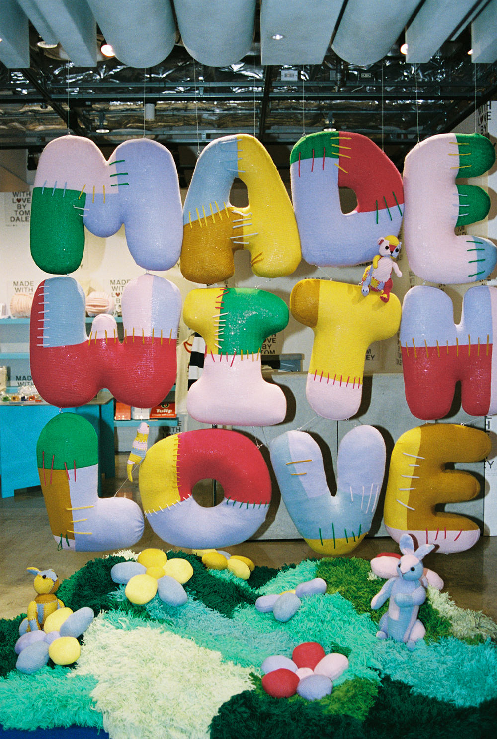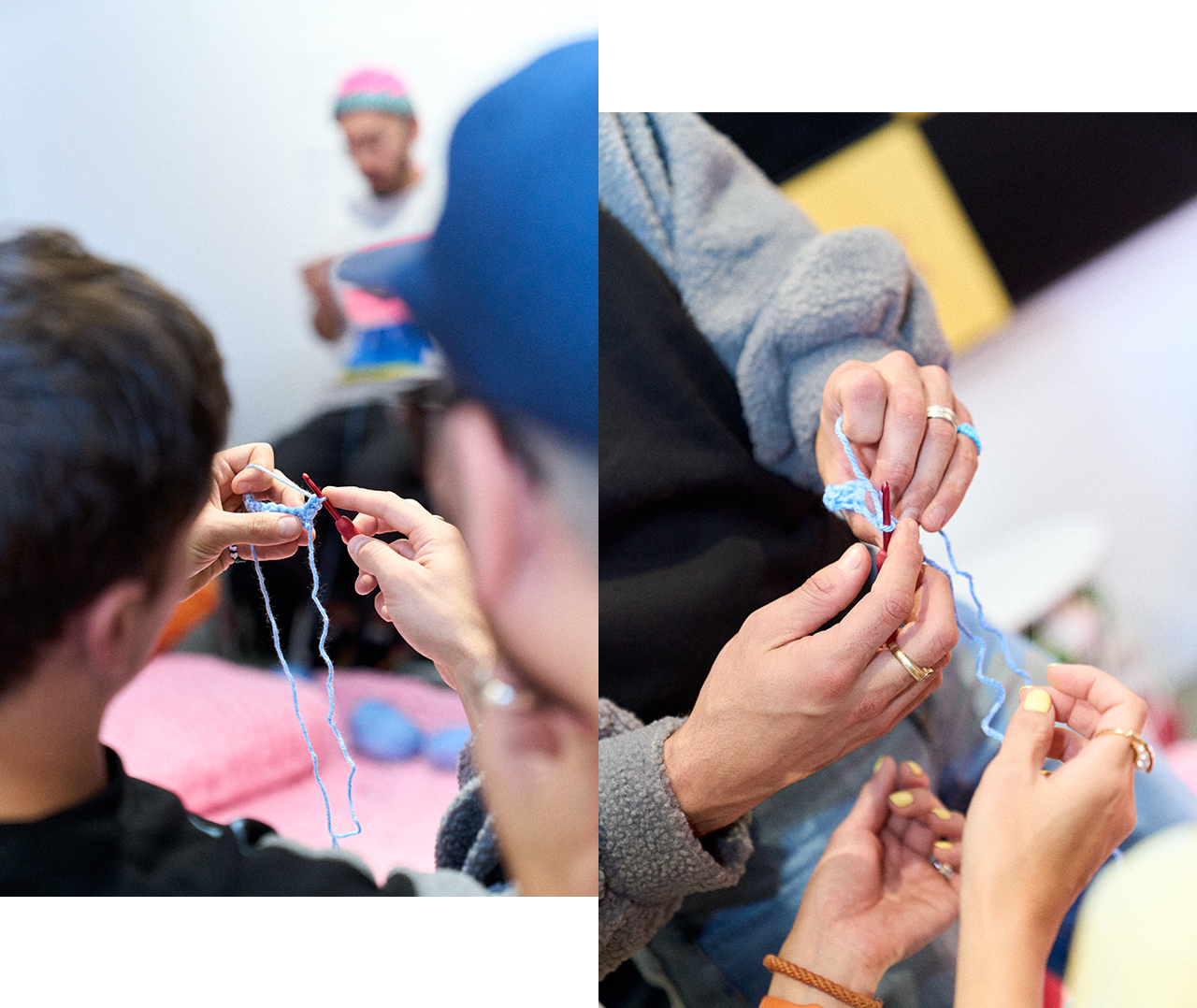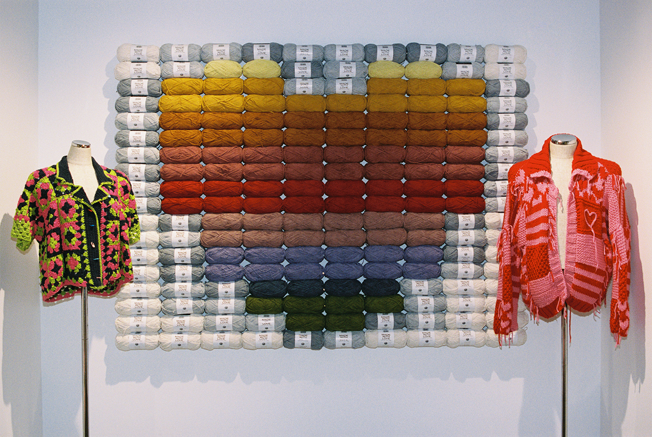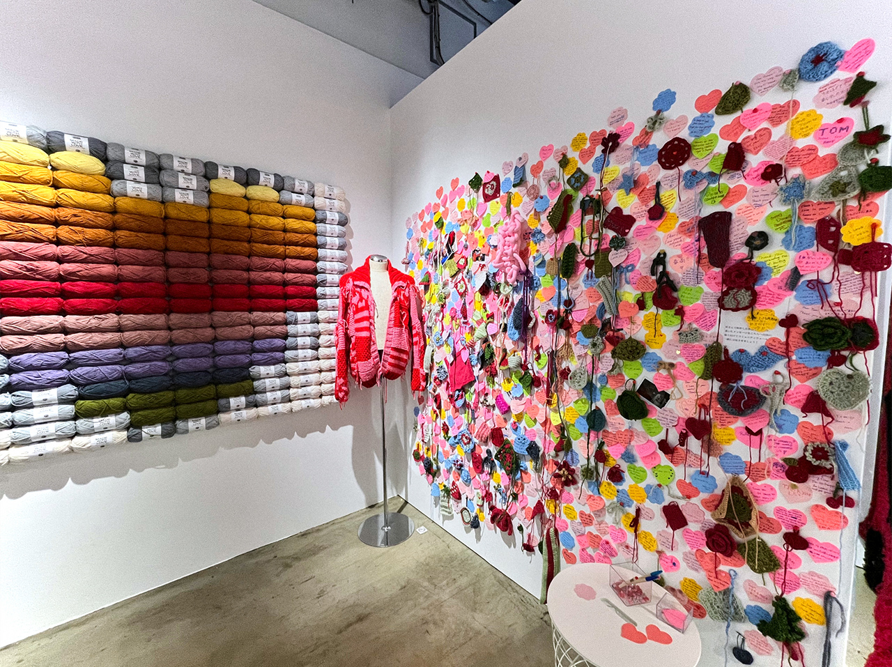 また会場には、訪れた人たちからのメッセージや、その場で編んだオーナメントを飾りつけることができる”コミュニティウォール”を設置。最初は白い壁だったスペースは時間が経つにつれカラフルに彩られ、終了時には隙間がないほどにあたたかな声や手触り感のあるオーナメントに埋め尽くされた。ニットのもつポジティブなパワーややすらぎが具現化されるとともに、編むという行為がなぜ人を惹きつけ癒すのかという魅力も表現され、愛のある心あたたまる空間に。寄せられたメッセージ&オーナメントは後日トム・デイリー氏の元へ届けられた。