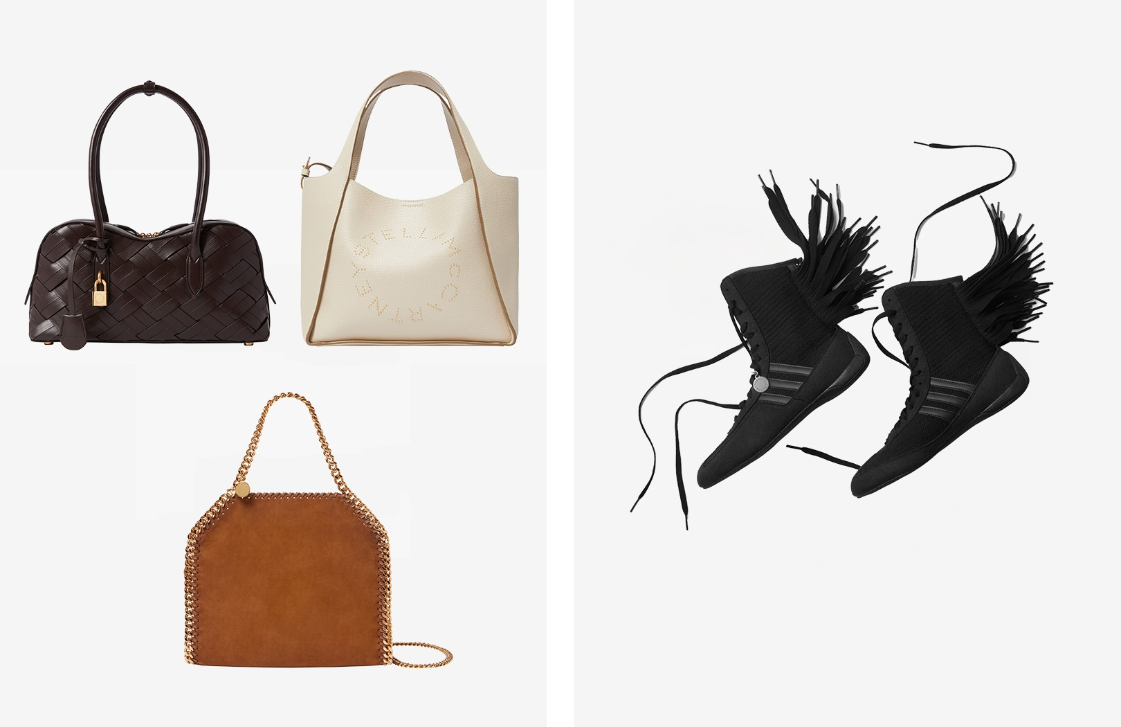 (左)ライダー ¥291,500、ステラ ロゴ クロスボディバッグ ¥160,600、ファラベラ ミニトートバッグ ¥200,200(右)ラサント スニーカー ¥41,800