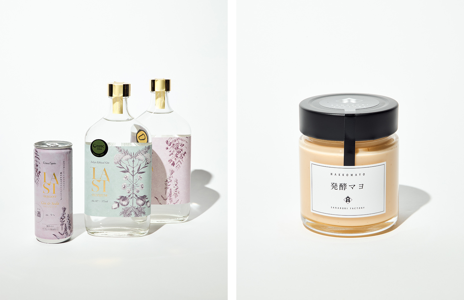 (左)LASTジンソーダ ¥275、エシカルジン LAST ELYSIUM ¥2,475、LAST ELEGANT ¥2,475、(右)発酵マヨ ¥648