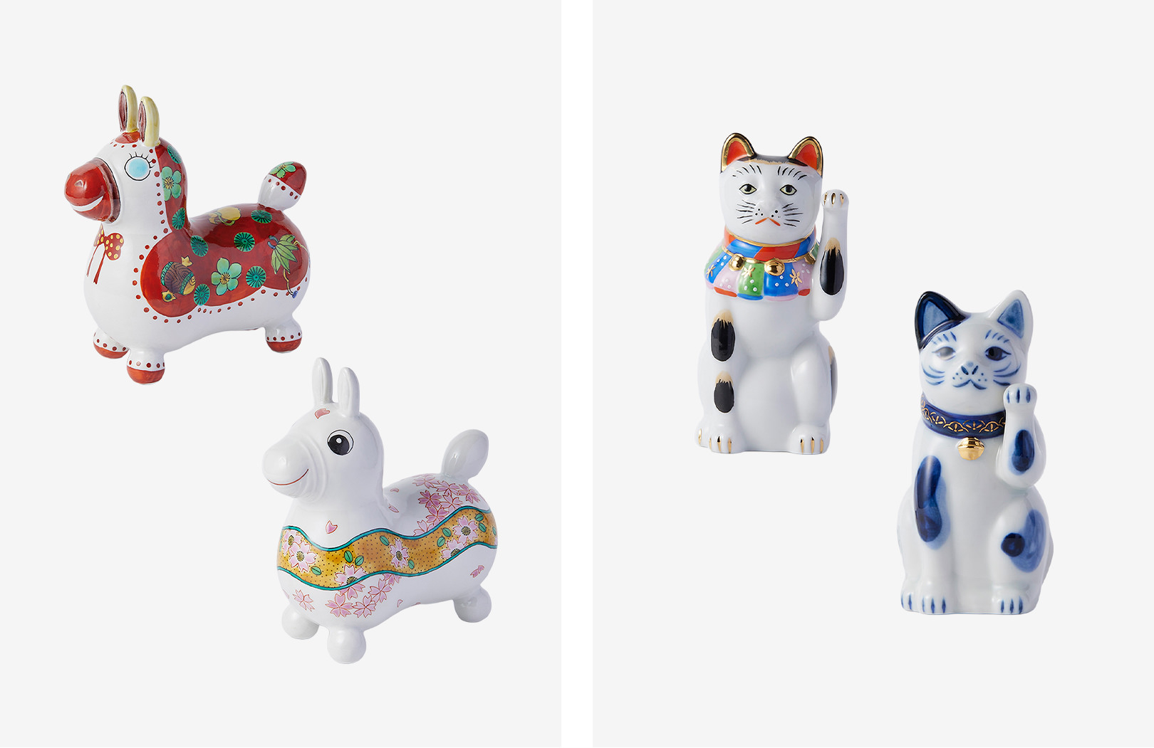 (左上)<九谷焼ロディ> 勝部明美作 赤木米縁起尽し文 ¥20,900、(左下)<九谷焼ロディ> 田中柚伎作 吉田屋桜文 ¥17,600(右上)<中外陶園> 招き猫 古瀬戸型 牡丹 左手3号 ¥6,600、(右上)<中外陶園> 招き猫 瀬戸型 染付 左手3号 ¥6,050