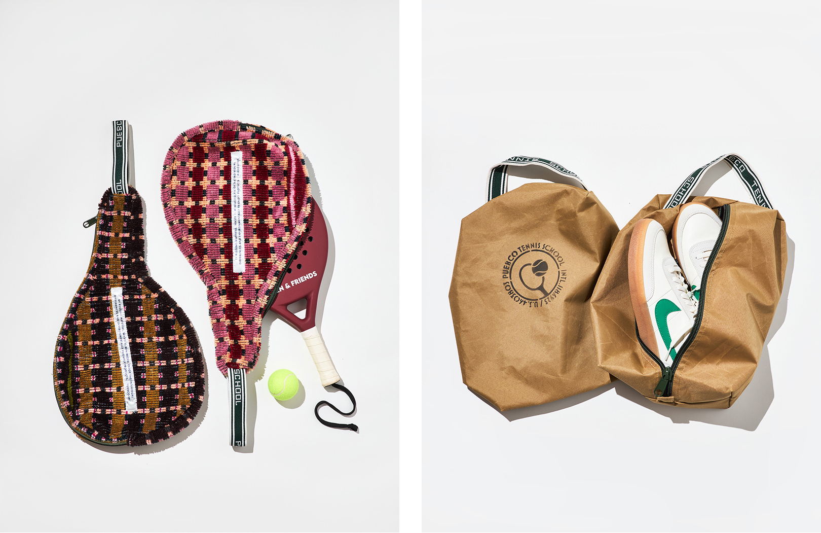 リサイクル原料やリユース素材を使って新しい価値観を創造する「PUEBCO」から、“〇〇〇専用のバッグ”と題したマニアックな視点のアイテムをご紹介。たとえば、パデルのラケットカバーは、インドのトラックの座席カバーとして流通していた素材を使用したもの。ブランドが契約している農村地域の人々に10色ほどの糸を渡し、それぞれのセンスで織ってもらったというユニークなアイテム。また、ゴム引きの生地を使用したシューズ用のバッグも長く活用してくれる逸品だ。