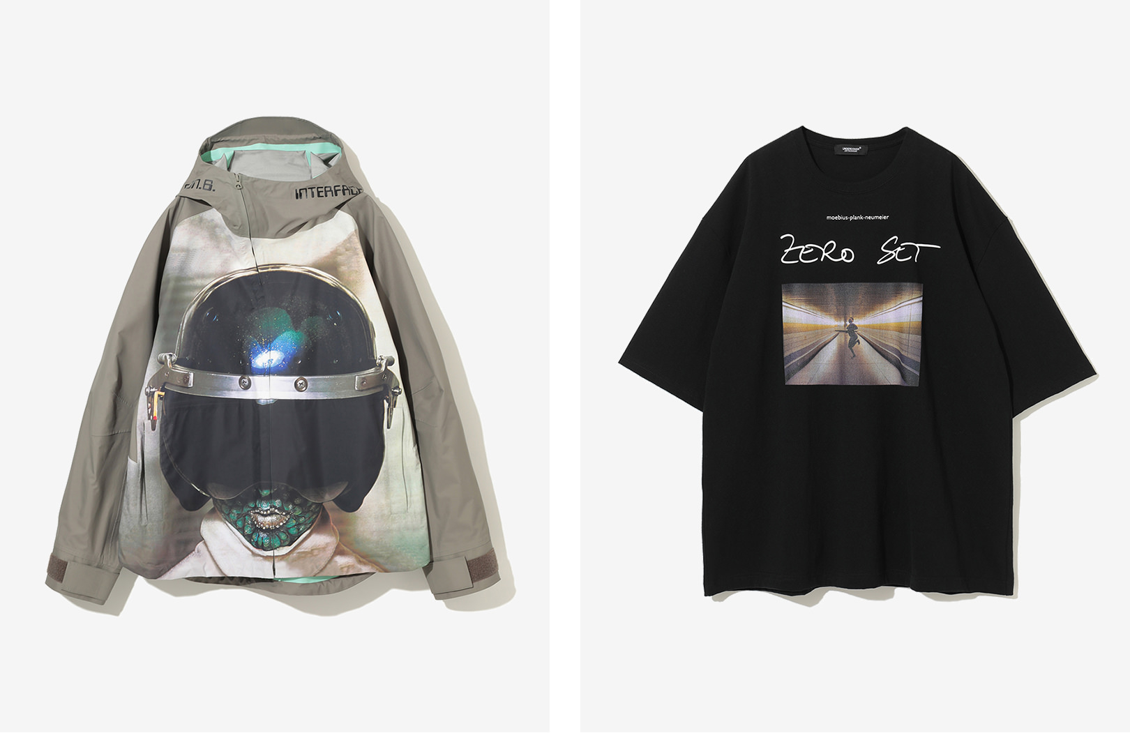 (左)Heldonアウター ¥198,000、(右)Dieter MoebiusTシャツ ¥26,400© 2025 Tapete Record