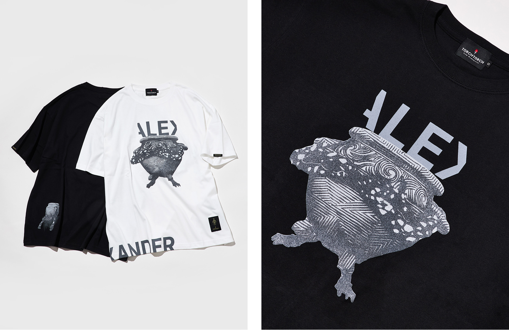 「TORCH TORCH」はファン心をくすぐるユニークなアイテムを展開する、ゲームを題材にしたアパレルブランド。アクションRPG『ELDEN RING』の人気キャラクターである戦士の壺、鉄拳アレキサンダーを描いたビッグシルエットTシャツを発売。勇ましく腕を組んで構えるアレキサンダーを、イラストレーター・芳川氏が幾何学的に描いている。また、フェルトのように立体的な質感のフロッキーとクラック(ひび割れ)インク、ラバーインクという3種の質感を組み合わせたこだわりも。