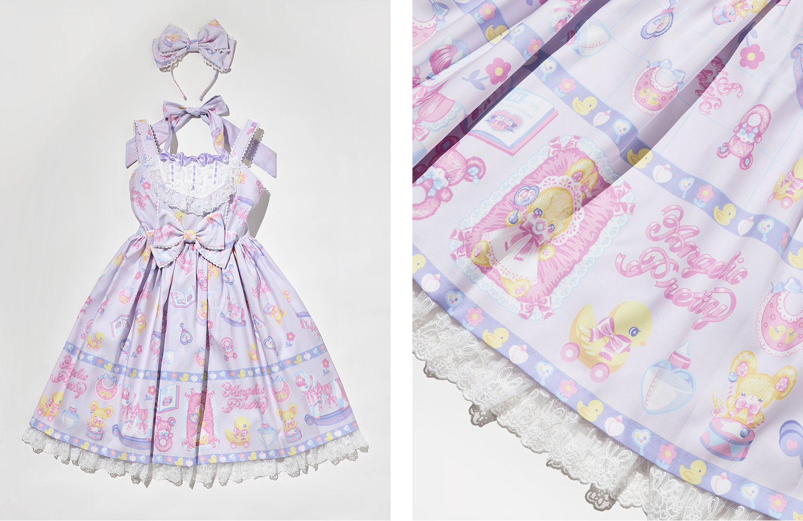 夢見る女の子たちのためのロリータファッションスタイルを提案する「アンジェリック プリティ」では、新作の「Baby Toys」シリーズを発売。オリジナルキャラクターのリリカルバニーの部屋をテーマにしたオリジナルプリント。愛くるしいはにかみベアーのラトルやファンシーカラーの木馬など、お気に入りのおもちゃに囲まれた、夢のような部屋が描かれている。特別色のラベンダーカラーのカチューシャとジャンパースカートは、他色展開とは違いセット商品として登場。リボンやレースのディテールがふんだんにあしらわれ、キュートな魅力たっぷり。