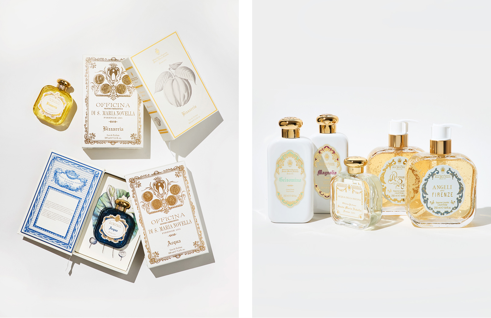(左)ジャルディーニ メディチェイ オードパルファム <50ml> ¥28,600、<100ml> ¥41,800(右)ジャルディーニ メディチェイ ボディミルク ¥9,900、フィレンツェ1221エディション オーデコロン <50ml> ¥15,400、<100ml> ¥22,000
