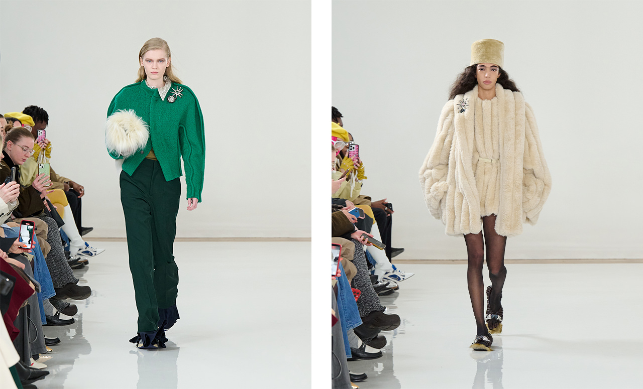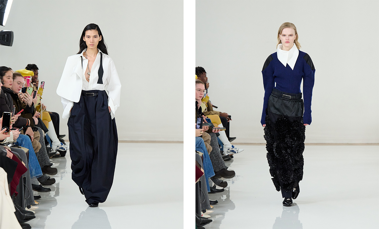 2025AWコレクションでは「Formal, Informal, Anti-formal」を掲げ、装いにおけるフォーマルの意義を追求。フォーマルとは時代遅れなのかを自身に問いかける中、デザイナーが見つけ出したのは写真家ウィリアム・エグルストンの装いだ。ビブフロントのようなピースが施された白シャツに黒の蝶ネクタイや首を隠すほど誇張された付け襟は、彼のフォーマルを崩す反抗美から着想を得たもの。また2017年に発表したミニスカートを再考し、蓋付きのユニークなミニスカートを展開。浮き輪のように膨らんだフォルムで、短い丈ながら力強い存在感を放ち、女性らしさという既成概念を打ち破る。