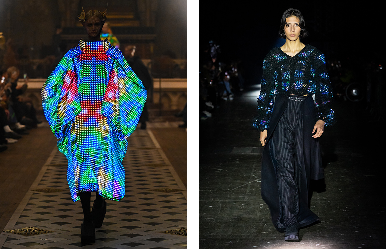 黒い服を液晶スクリーンに見立て、色、模様、言葉を映し出す未来を投影した2025AWコレクション。RGBの光が生命のように変化し、服は着る人の気分や意思を映し出すメディアへと進化。服は新たな皮膚のように、他者と共有できるファッションのインターフェースに変容する。LEDを織り込んだ柔らかな糸や液晶スクリーンの素材は、MPLUSPLUSとの共同開発によって誕生。折り、編み、縫うといった全工程に対応するほど柔軟性があり、身体に沿って光を纏うのが特徴だ。デザインは完成することなく、常に更新されていくもの。服が情報を纏う時代が始まろうとしている。