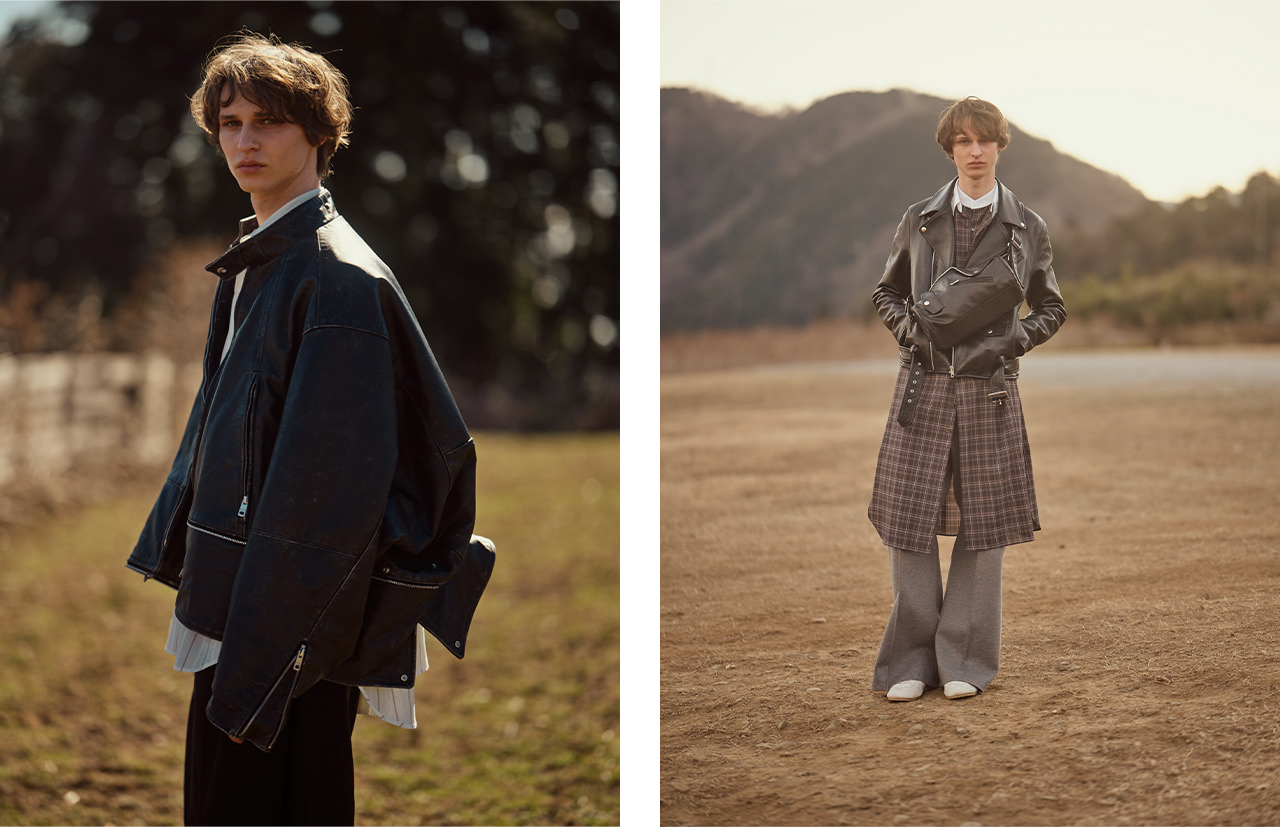 新しいデザイン⼿法や⾃由な発想が生むパターンメイキングなど、20にも及ぶハウスコードにフォーカスした今シーズン。たとえば、表と裏、男と⼥、⼤⼈と⼦どもなど、相反するものを共存させる「Side-C」は、ブランドの考え⽅に共通するハウスコード。アイコニックなレザージャケットをはじめ、一⾒すると⼦ども服のようなサイジングで年齢や体型を問わないテクニックである「キッズ」もデビューから変わらない重要なものだ。そのほか「ダブルエンド」や「マルチレイヤリング」といったハウスコードは、一着の服に新たな可能性や機能性をもたらす。期間中、「マルチレイヤリング」のハウスコードを用いた「NANGA」とのコラボダウンの先行展示・受注を実施予定。